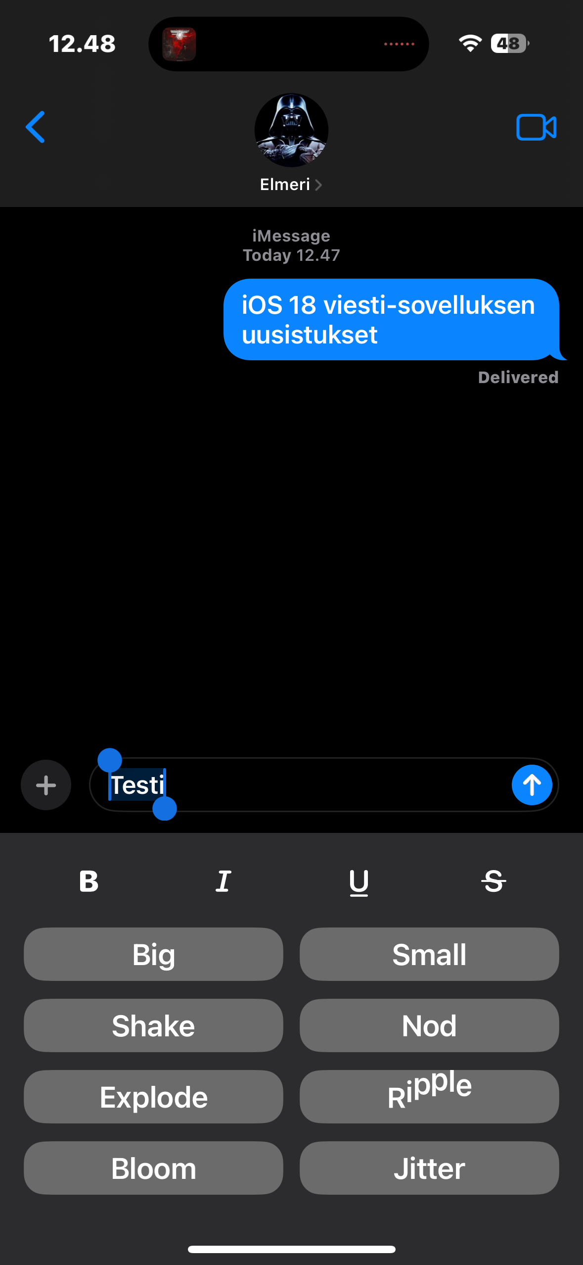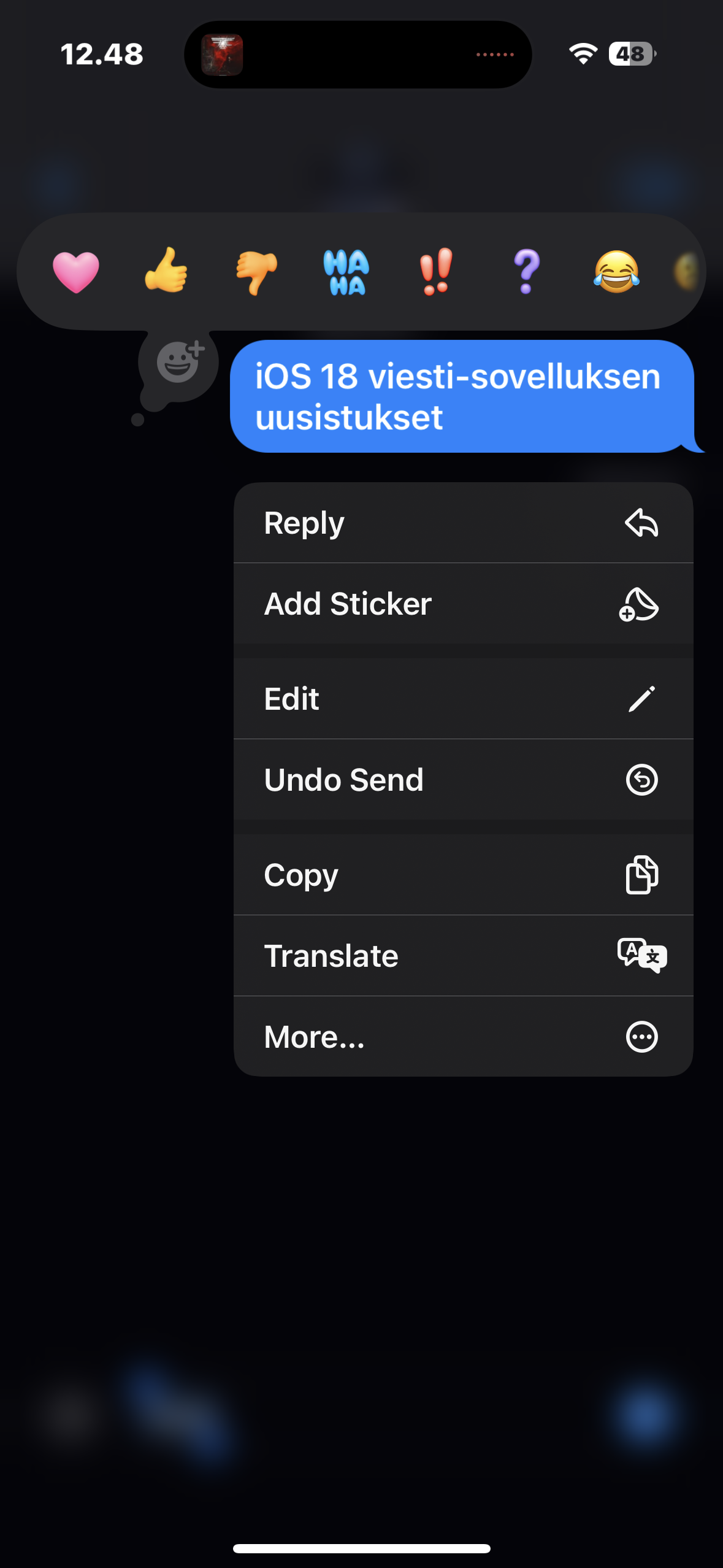 Viestit-sovellukseen on tullut tuki erilaisille tekstin muotoiluille ja efekteille, jotka ovat viestintää monipuolistavia muutoksia. Viesteihin voi nyt reagoida millä tahansa emojilla, kun aiemmin reaktiot ovat rajautuneet muutamiin Applen omiin reaktioihin. Mukana on myös ajastetut viestit, josta en itse toistaiseksi ole löytänyt kokeilua lukuun ottamatta hyötyjä.