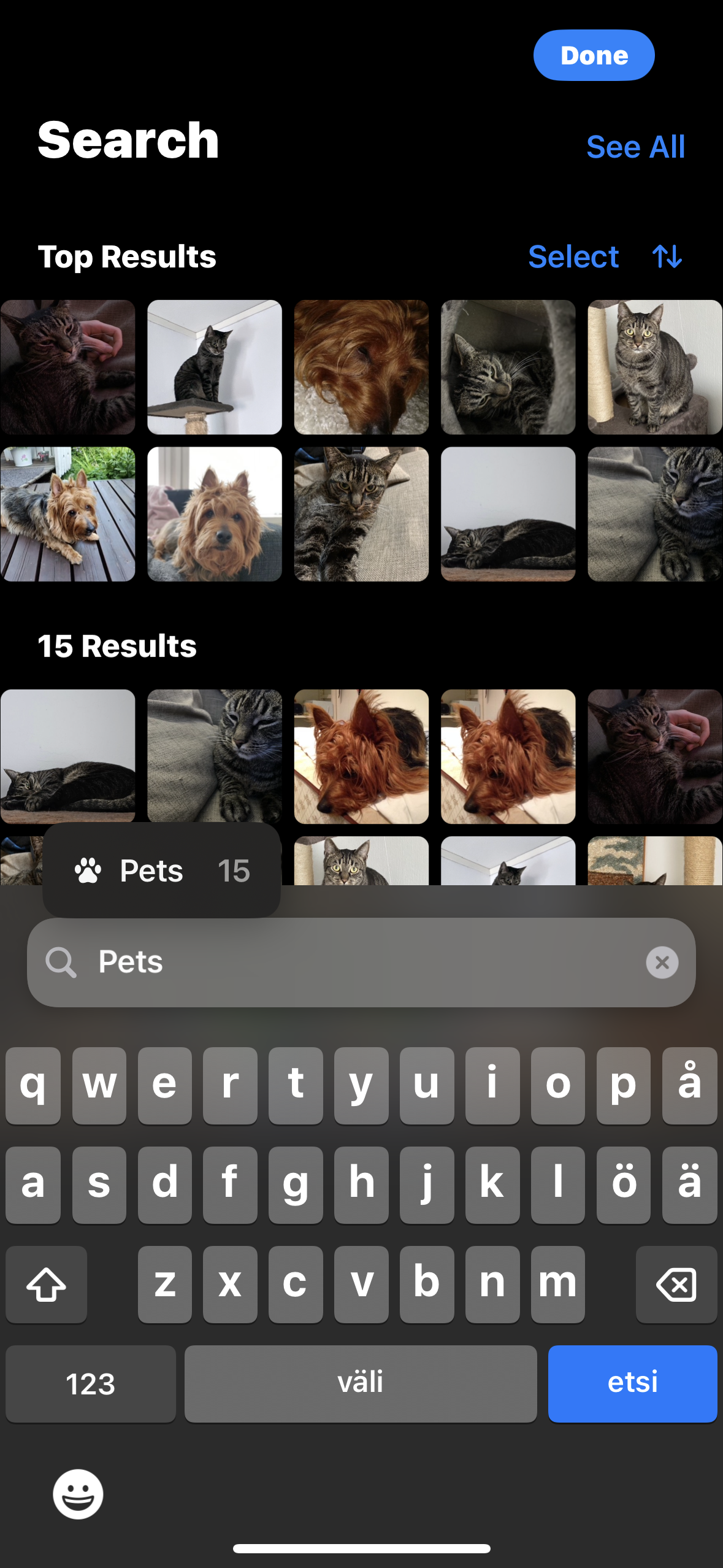 Hakutoiminnon avulla sovelluksesta voidaan hakea kuvia esimerkiksi nimellä “eläin” tai “viime vuosi”. Ominaisuus vaikuttaa toimivan hyvin jo tässä vaiheessa.