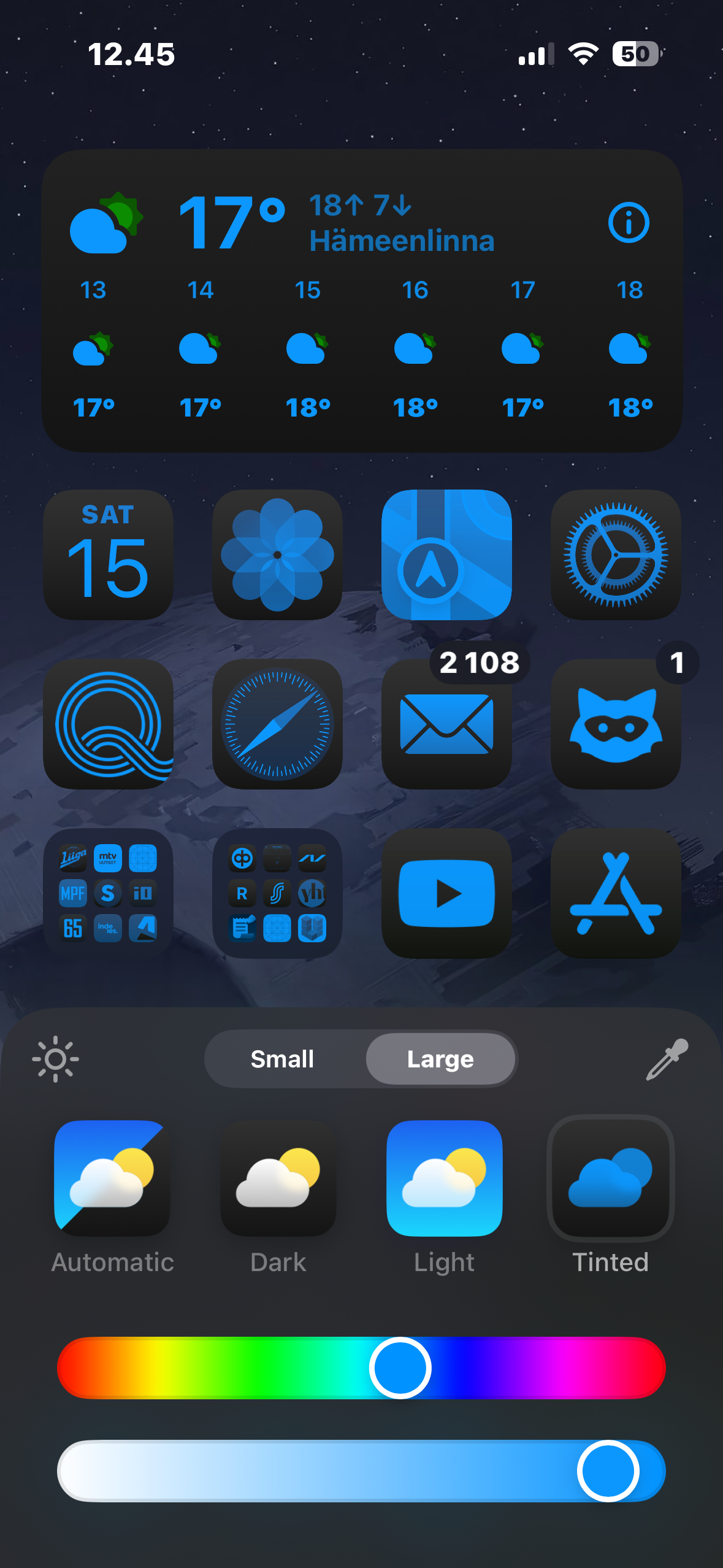 Ominaisuuden koin toimivan hyvin ja muokkausasetukset ovat selkeät. Toistaiseksi, kun kolmannet osapuolet eivät ole kehittäneet omiin sovelluksiinsa tummia kuvakkeita, niin ominaisuuden hyöty jää häiritsemään, kun ainoastaan Applen omat sovelluskuvakkeet vaihtuvat tummaksi. Toivon todella, että kolmansien osapuolten osalta asiaan tulee muutos ajan mittaan, sillä pidän tummia kuvakkeita miellyttän näköisinä.