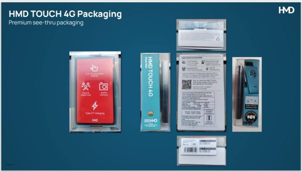 Pakkauksesta löytyy läpinäkyvä muovikuori, pikalaturi, USB Type-C -kaapeli ja itse laite. HMD näyttää panostaneen myös myyntipakkauksen ulkoasuun, sillä Touch 4G toimitetaan läpinäkyvässä rasiassa, josta puhelin on heti nähtävissä.