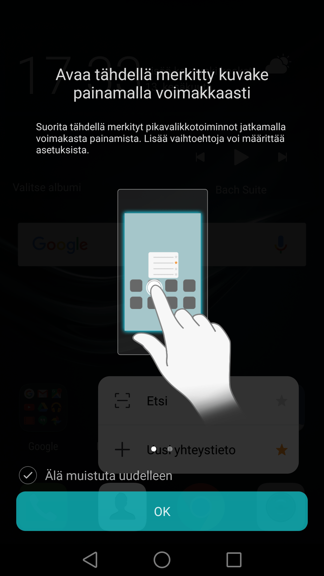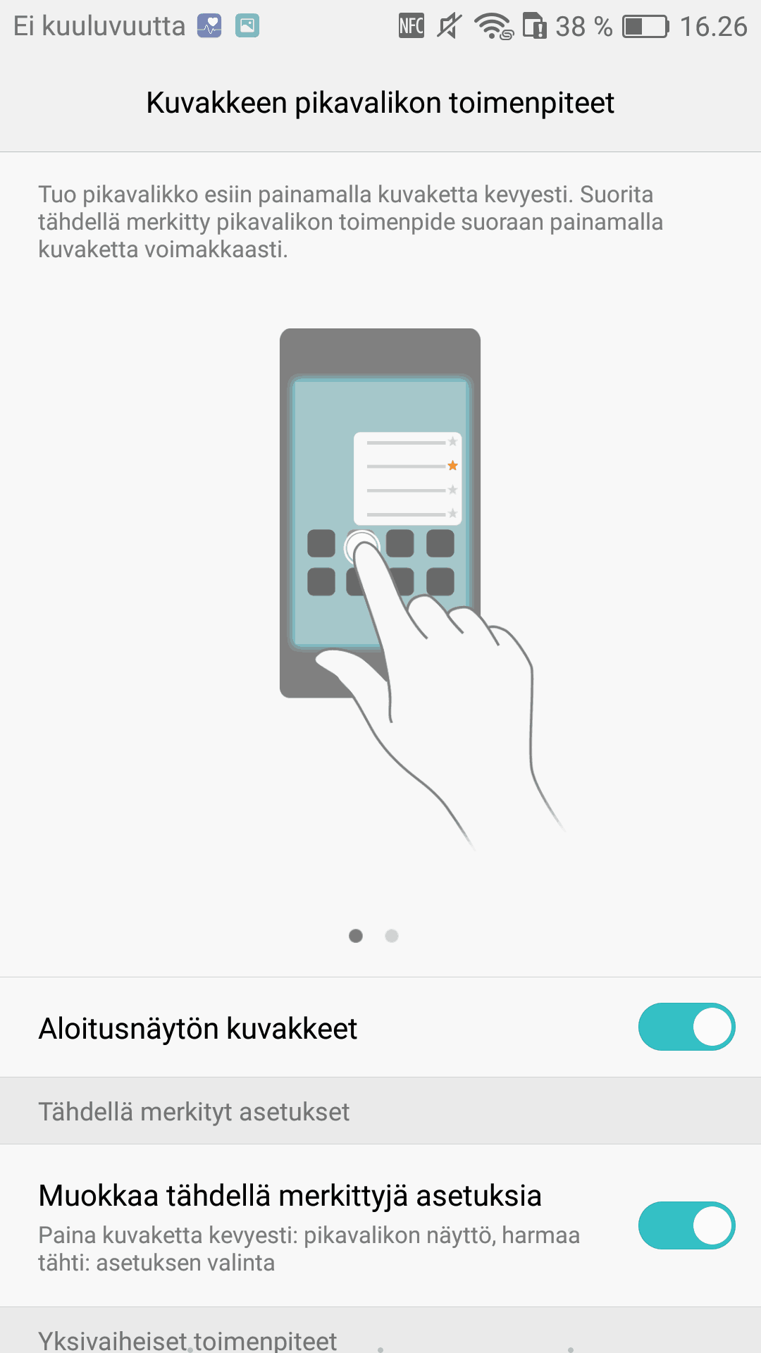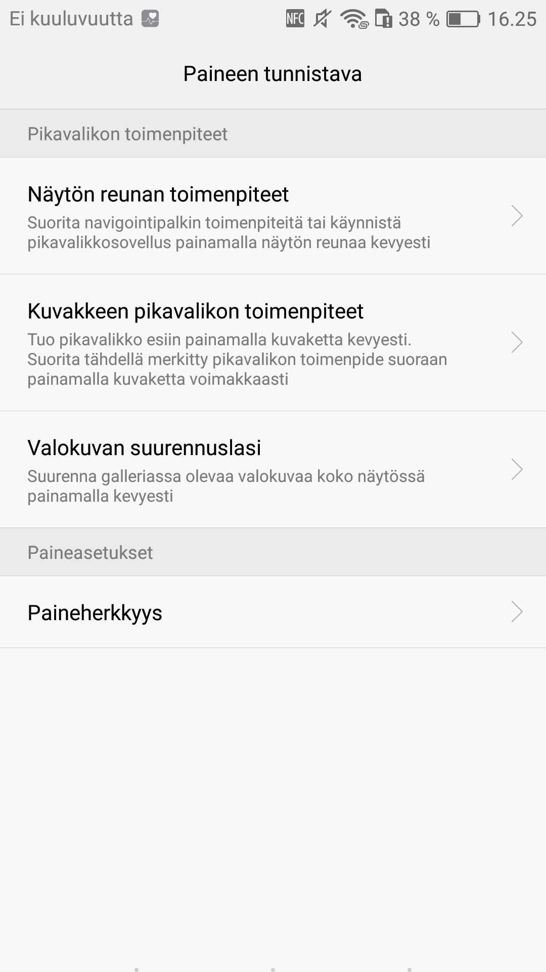 Huawein Press Touch mahdollistaa myös iPhone -malleista tutuksi tulleet sovellusten pikavalinnat, jotka tulee esille painettaessa sovelluskuvaketta aloitusnäytössä hieman normaalia kovempaa. Vaikka en ominaisuudesta kauheasti valittänytkään iPhone 6s -mallien kohdalla, niin eipä se yhtään sen hyödyllisempi ole myöskään Huawein toteuttamana. Ajatuksiani Applen 3D Touchista voi käydä lukemassa iPhone 6s sekä iPhone 6s Plus arvostelusta.
