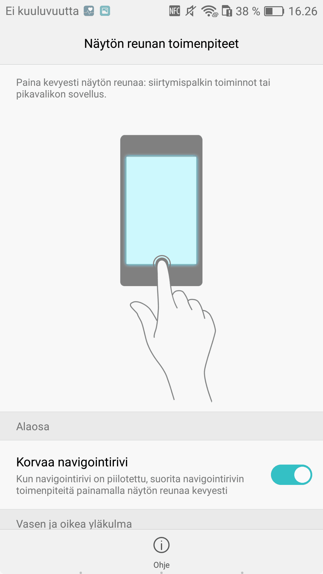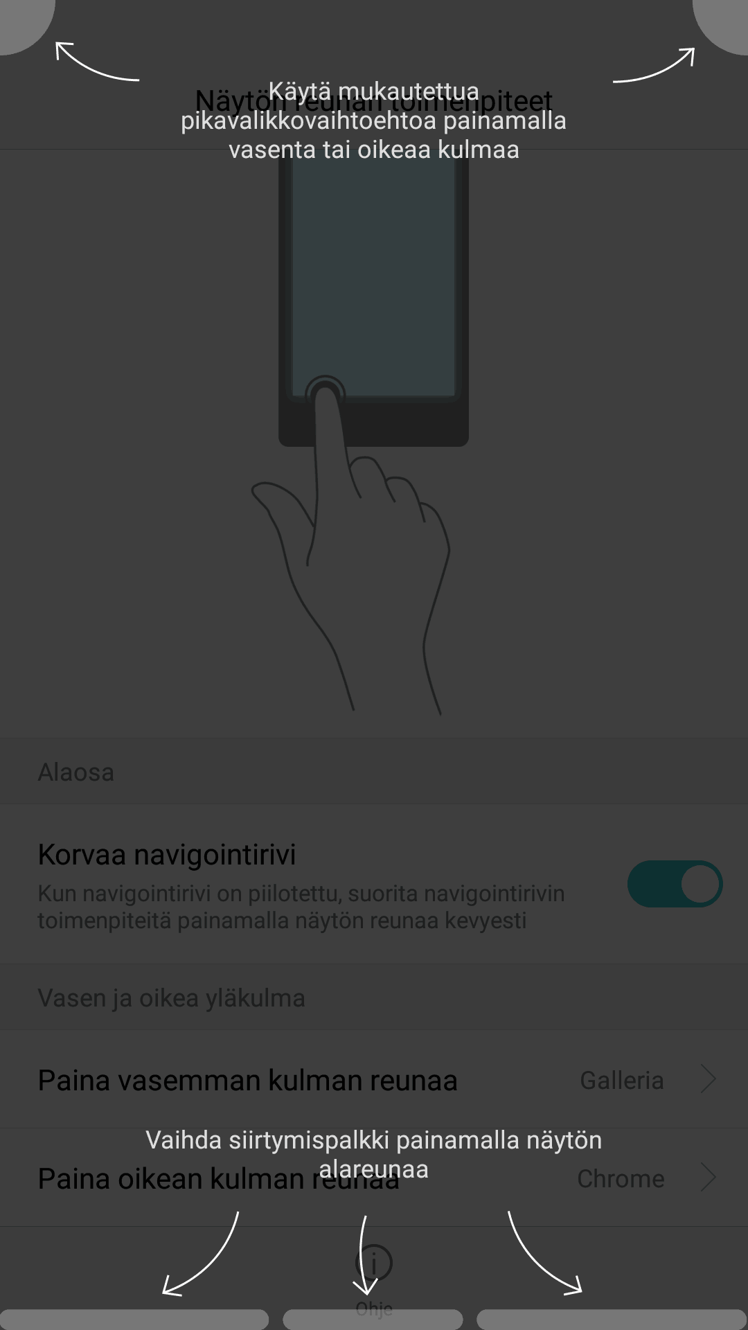 Toinen keksiliäs ominaisuus on kaksi pikavalikkoa, jotka eivät ole missään näkyvissä. Puhelimeen saa kaksi pikavalintaa näytön yläkulmiin, joista painamalla saa sovelluksen auki, joka on siihen pikavalikkoon asetettu asetusten kautta. Valikoihin voi valita ihan minkä sovelluksen vain, joka löytyy puhelimesta asennettuna. Ominaisuus helpottaa puhelimen käyttöä ja tekee näin oivan oikopolun itselle tarpeelliseen sovellukseen.