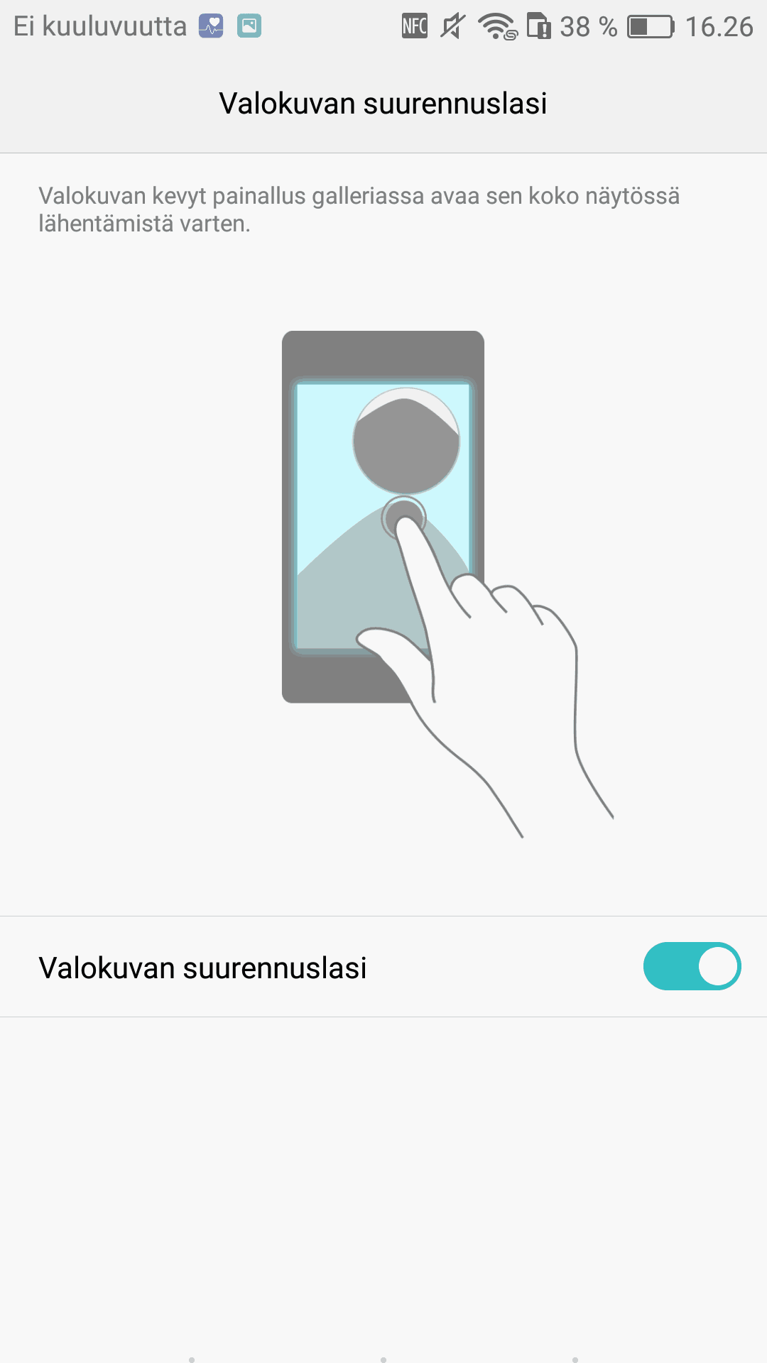 Kolmas Press Touchille hyödyllinen ominaisuus on mielestäni kuvien suurennus mahdollisuus helposti ”suurennuslasin” avustuksella. Ominaisuus on kuitenkin varsin rajallisesti käytössä. Ainoa paikka, jossa suurennuslasia voi käyttää on Huawein oma galleria-sovellus. Suurennuslasi on kuitenkin hyödyllinen ja toimivasti toteutettu. Ominaisuus toimii kaikessa yksinkertaisuudessaan vain painamalla näyttöä hieman kovempaa kuvan ollessa avattuna, jolloin esille tulee suurennuslasi suurennetun kuvan kera. Eri tasoisilla painalluksilla kuvaa voi zoomata joko sisään tai ulospäin.