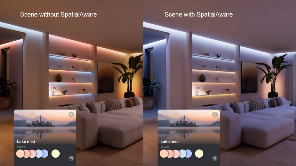 Ominaisuus on saatavilla Bridge Prolle, ja se toimii heti noin puolessa Hue-sovelluksen remasteroiduista valaistusasetuksista. Erityisen hyvin SpatialAware pääsee oikeuksiinsa luonnosta inspiroituneissa teemoissa, kuten Sumuinen järvi, Tuulenhenkäys vuorelta ja Auringonlasku savannilla.