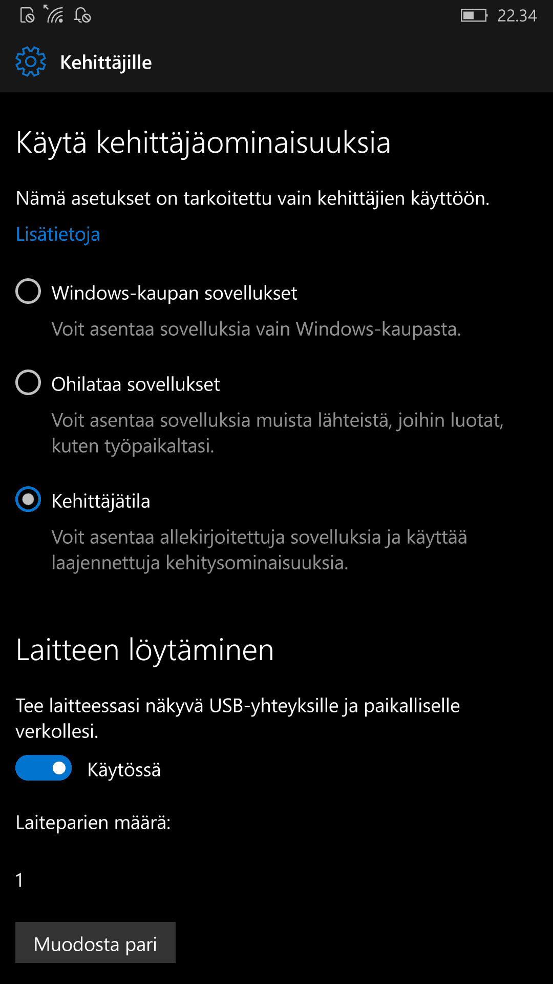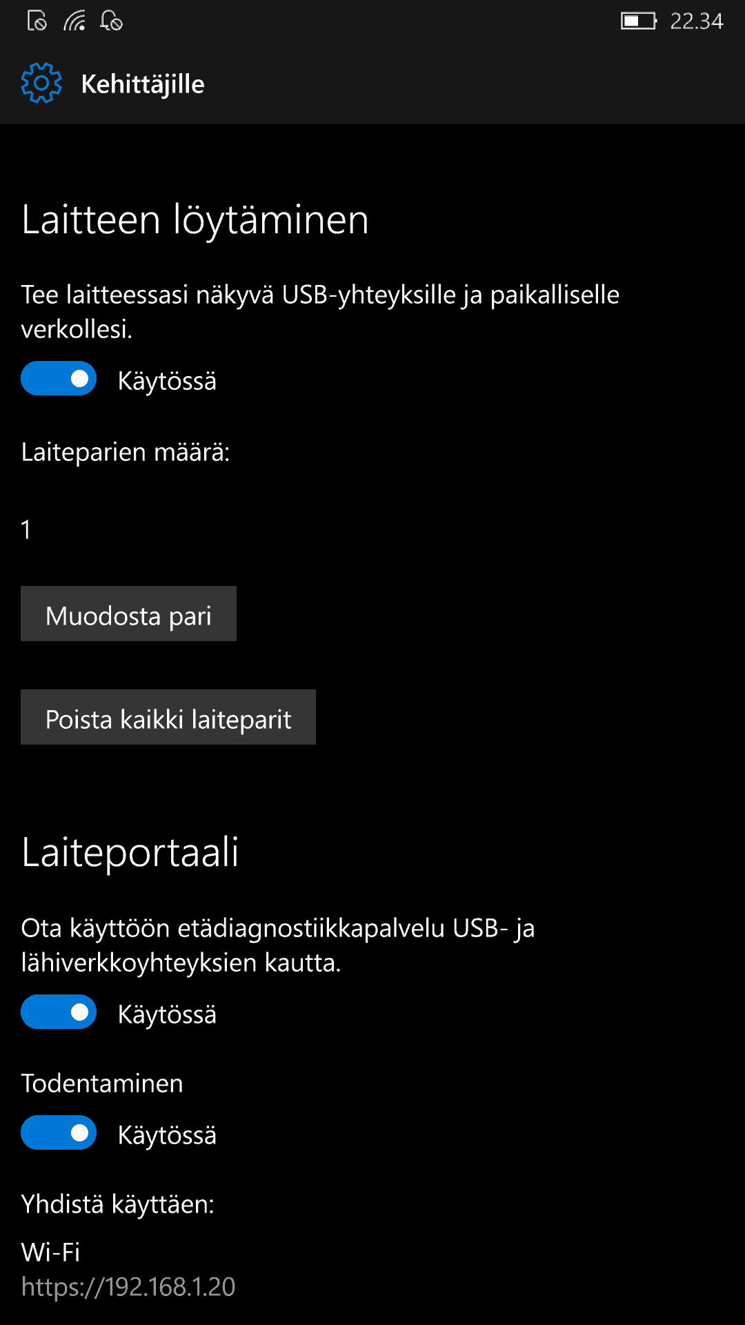- Ota käyttöön Laiteportaali puhelimesta. Asetukset > Kehittäjille > paina Kehittäjätila, Laitteen löytäminen sekä Laiteportaali päälle