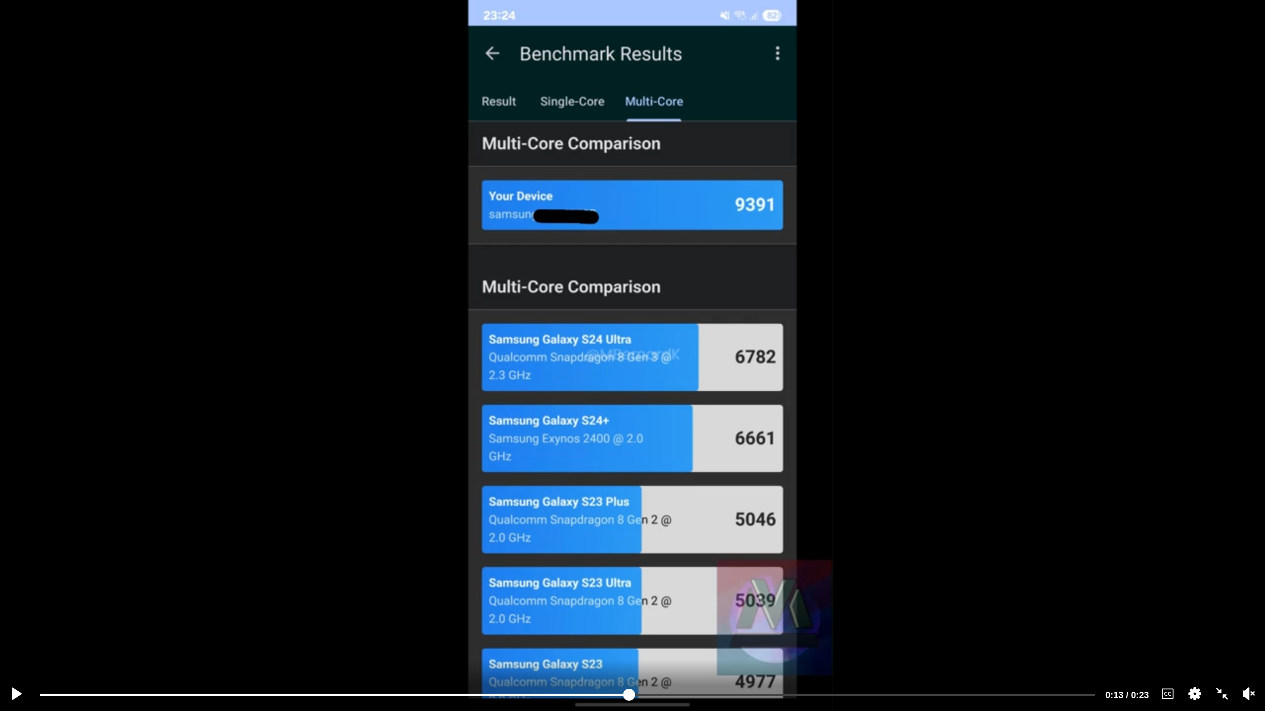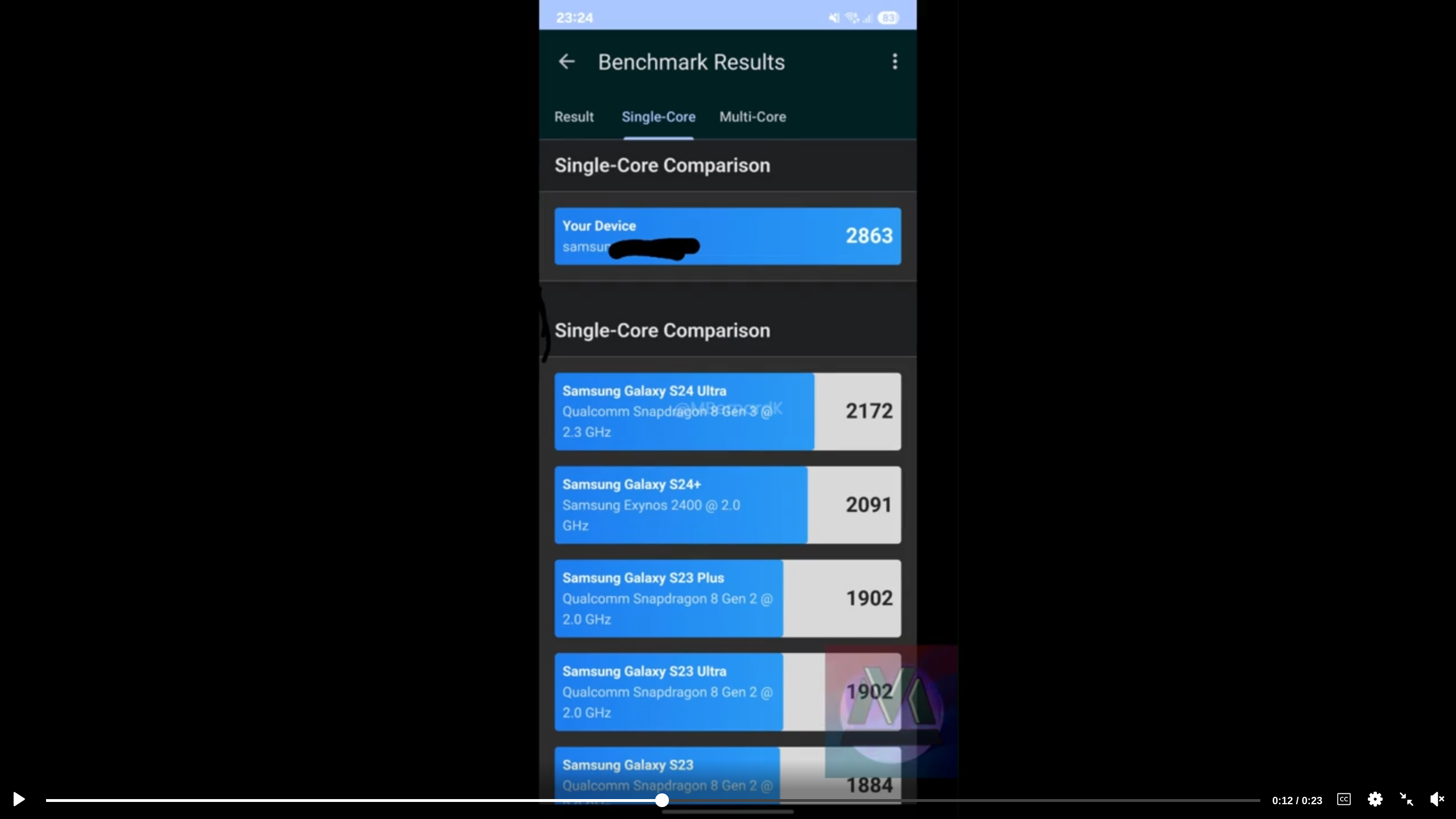 Käyttäjä on kuvien perusteella ajanut myös Geekbench-suorituskykytestin, josta Galaxy S25 Ultra on saanut tulokseksi yhden ytimen osalta 2627 pistettä ja kaikkien ytimien osalta 9404 pistettä. Sovellus paljastaa, että puhelin saa hieman korkeammilla kellotaajuuksilla toimivan Snapdragon 8 Elite -suorittimen, sillä kaksi tehoydintä pyörivät laitteella 4,47 Ghz:n kellotaajuudella, kun Qualcommin vakiokellotaajuudet piirille ovat 4,32 gigahertsiä. Kuusi virtapihimpää ydintä toimivat normaalilla 3,53 Ghz:n kellotaajuudella.