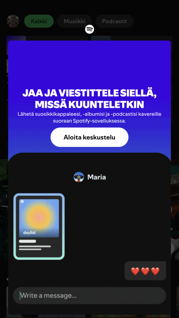 Spotify on laajentanut uuden Messages-viestitoimintonsa saataville myös Suomessa. Ominaisuudesta on tänään ilmoitettu käyttäjille, jotka ovat avanneet Spotify-sovelluksen.
