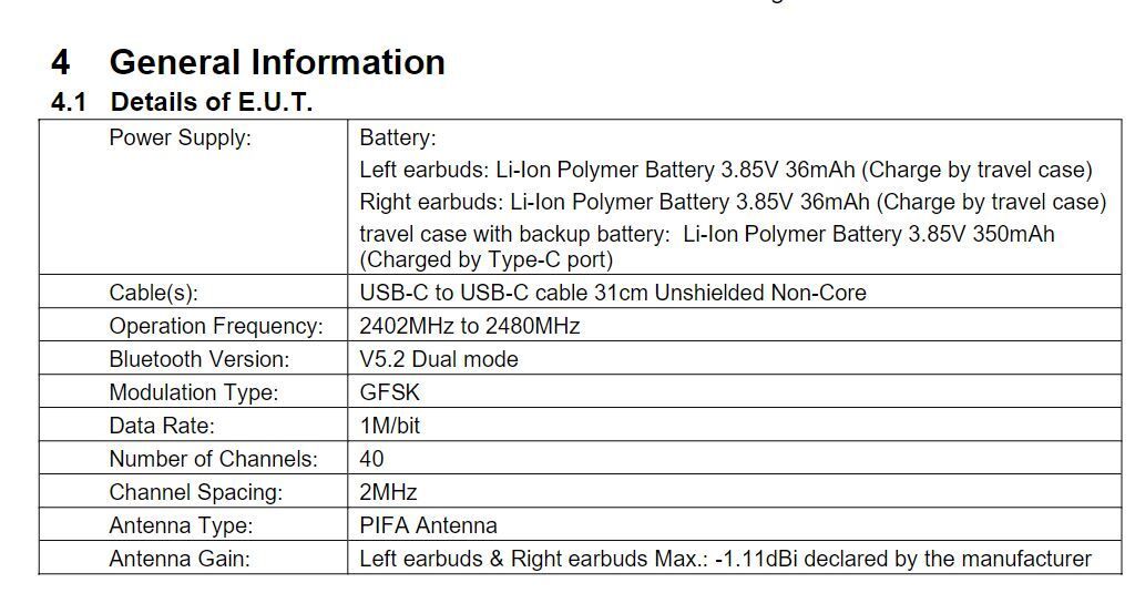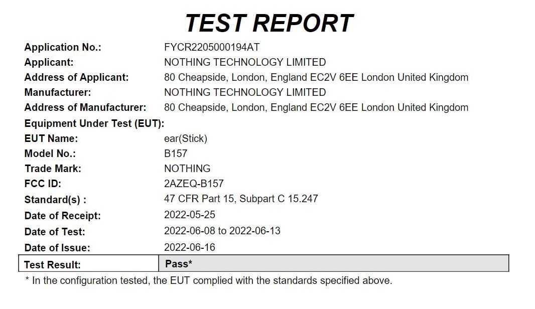 Kuulokkeiden mallinumeroksi ilmoitetaan ”B157”, ja vuodon kohteena olevat kuulokkeet on rekisteröity Nothing Tecnology Ltd. -nimiselle yritykselle Lontooseen. Tietokannan tiedoista paljastuu kuulokkeiden sekä kuulokekotelon akun koko. Molemmista kuulokkeista löytyy 36 milliampeeritunnin akku ja latauskotelossa puolestaan on 350 milliampeeritunnin akku. Latauskoteloa ladataan USB-C-kaapelilla, jonka mitta on 31 senttimetriä.
