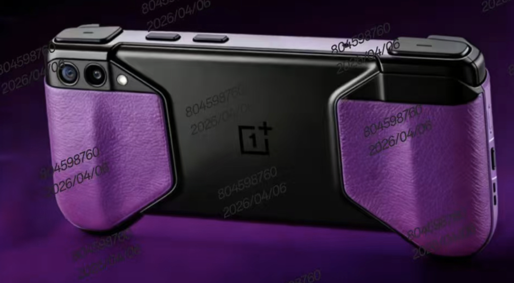 Kuvan perusteella laitteessa nähdään molemmilla sivuilla violetit, teksturoidut kahvaosat, jotka viittaavat vahvasti pelikäyttöön. Lisäksi laitteessa näyttäisi olevan olkapainikkeet, sivulle sijoitetut äänenvoimakkuuspainikkeet sekä alareunassa USB-C-liitäntä.