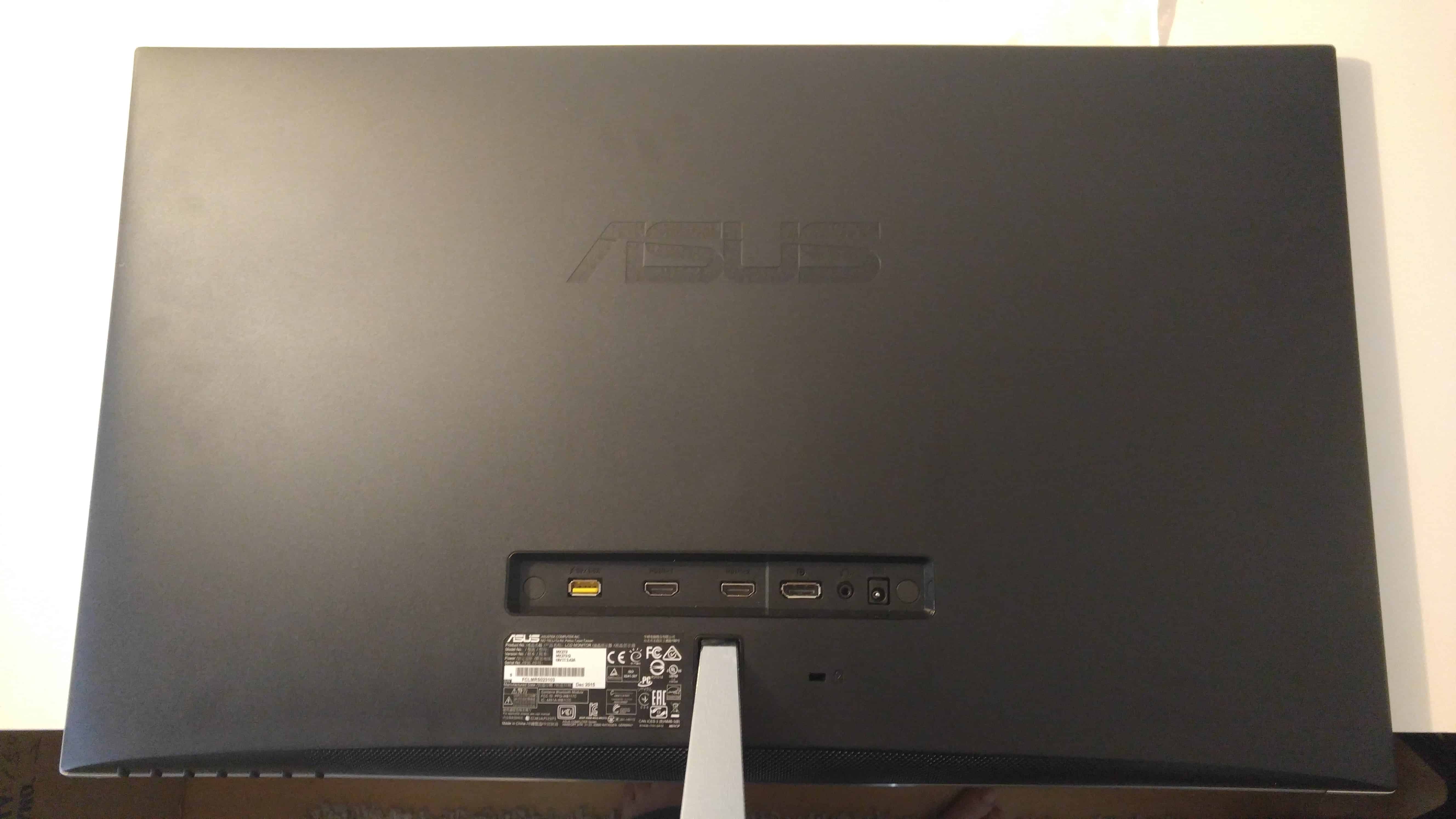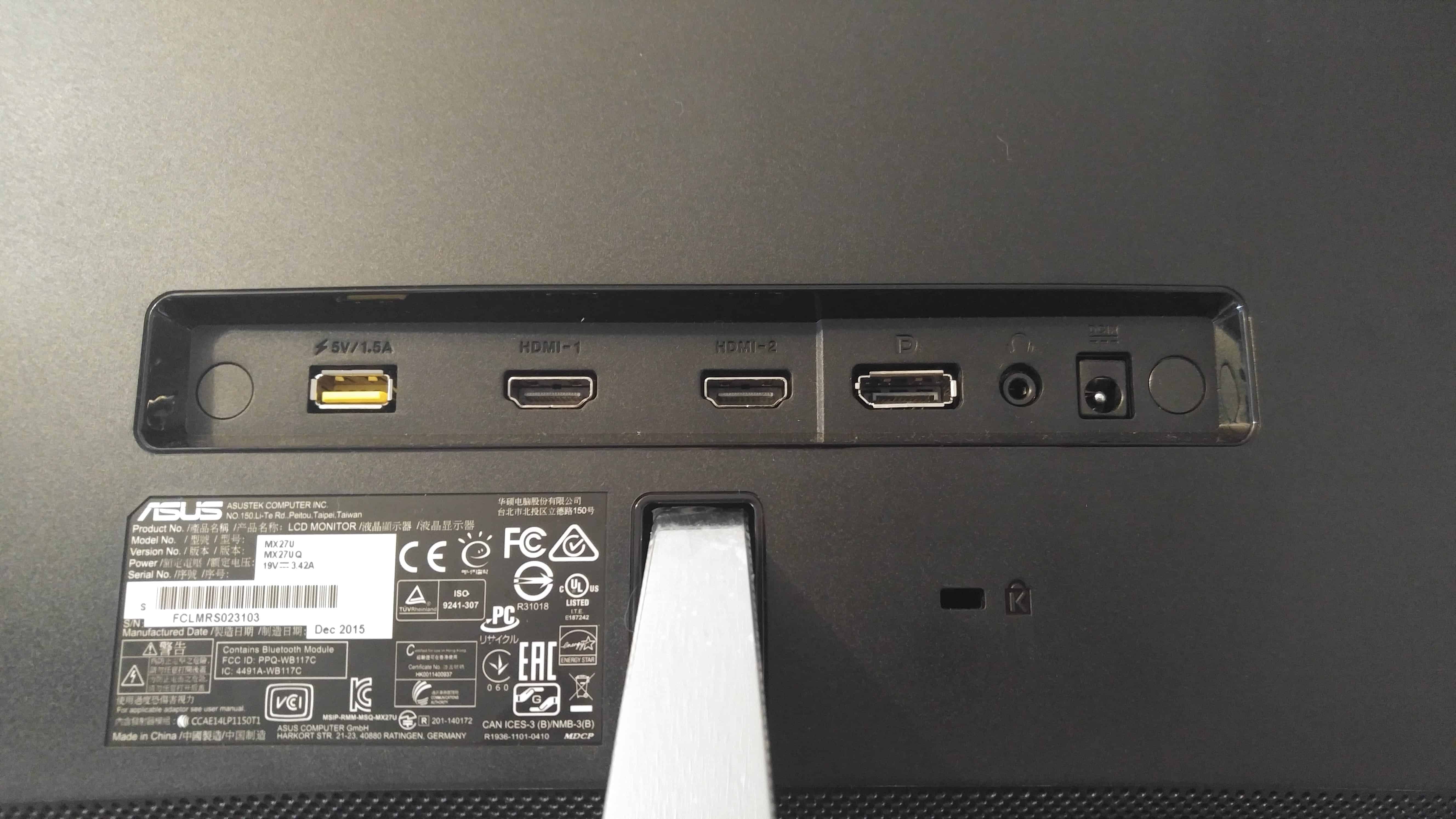 ASUS MX27UQ takaseinä on valmistettu mustasta muovista, ja sen keskellä komeilee ASUS-logo. Näytön liitännät sijaitsevat hieman jalan kiinnityksen yläpuolella, mutta johtojen liittäminen näyttöön ei tuota ongelmia. Näytöstä löytyy monenlaista liitäntää, kuten tämän hintaluokan näytössä kuuluukin. Valitettavasti DVI-liitäntää eikä VGA-liitäntää löydy. Näytöstä sen sijaan löytyy 4K-tukea 60Hz:ssä tarjoavat DisplayPort ja HDMI 2.0, myös HDMI 1.4 liitäntä löytyy ja se tukee 4K-kuvaa 30Hz:ssä. Myös kuulokkeille löytyy oma 3.5mm liitäntä ja mukaan on vielä saatu SuperSpeed USB-laturi. Tietenkin näytössä on paikka myös virtajohdolle.