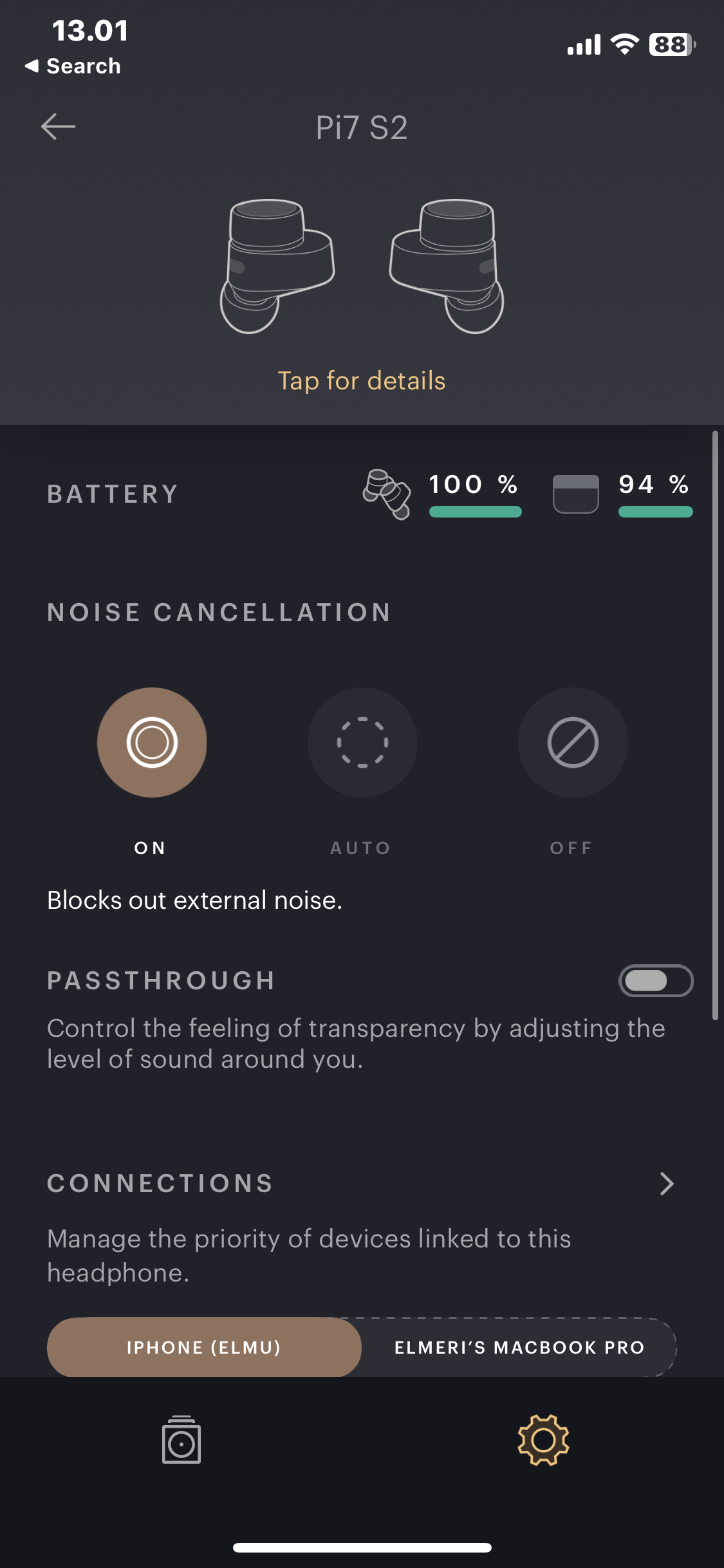 Pi7 S2 -kuulokkeiden akunkeston koin hyväksi. Latasin kuulokkeet testijakson aikana muutaman kerran ja omalla käytölläni pääsen noin viikon kerrallaan lataamatta kuulokekoteloa. Bowers & Wilkins lupaa kuulokkeille vain noin 5 tunnin akunkestoa aktiivisen taustamelunvaimennuksen ollessa kytkettynä pois. Taustamelunvaimennuksen kanssa aika on tuotakin pienempi.