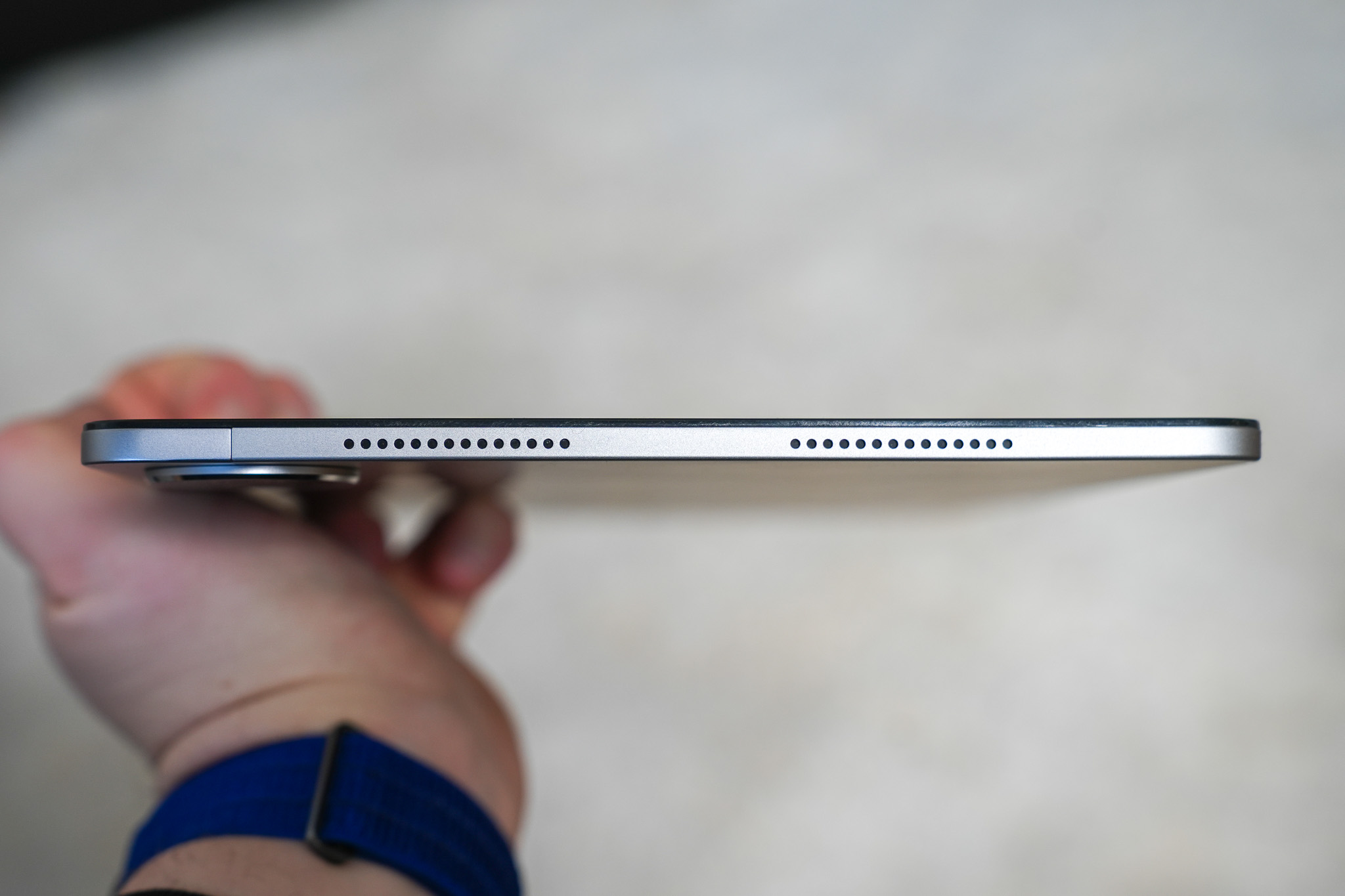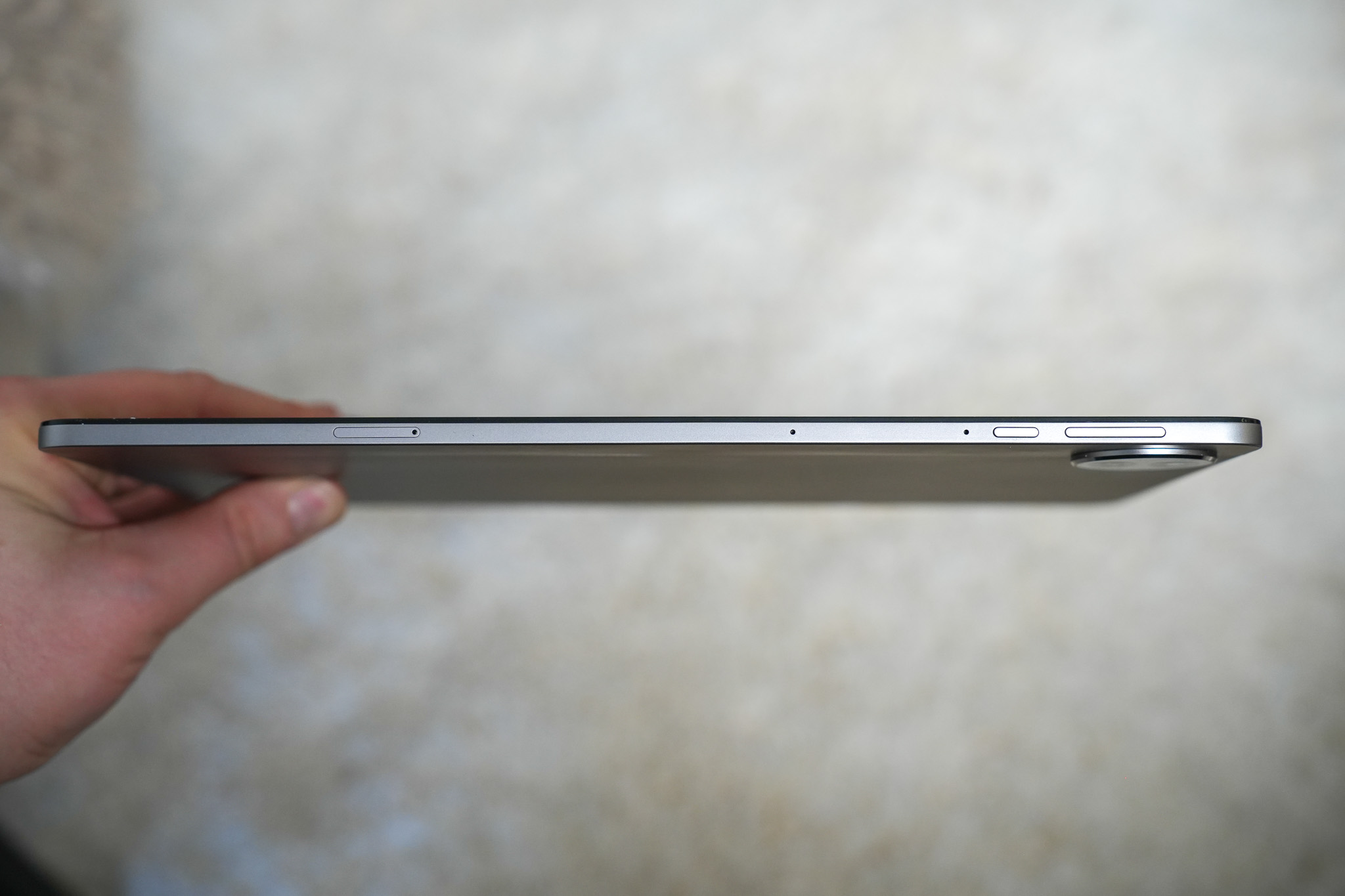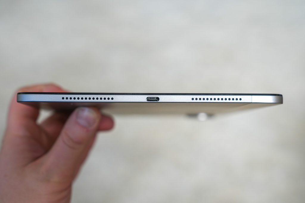 Virtapainike ja äänenvoimakkuuspainikkeet sijaitsevat tabletin yläreunassa, joiden ohella mukana on myös kaksi mikrofonia sekä SIM-korttitelakka. Oikealta sivulta löytyy USB-C-liitin latausta varten. Kaiuttimia on yhteensä kuusi, ja ne on sijoitettu laitteen molemmille pitkille sivuille, neljään erilliseen kaiutinritilään. Alareuna on jätetty tyhjäksi.