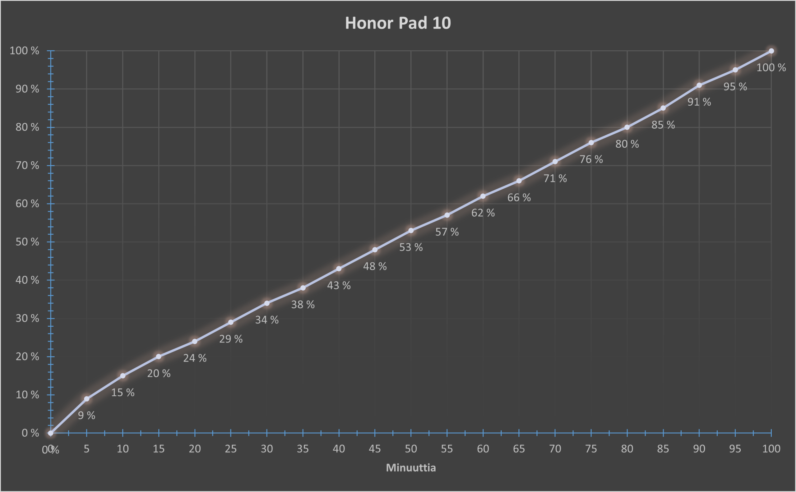 Testissä tabletti latautui tyhjästä täyteen noin 100 minuutissa, mikä on hyvä suoritus tämän kokoiselle akulle. Lataustestin tulokset ovat nähtävillä alapuolella olevasta kaaviosta.