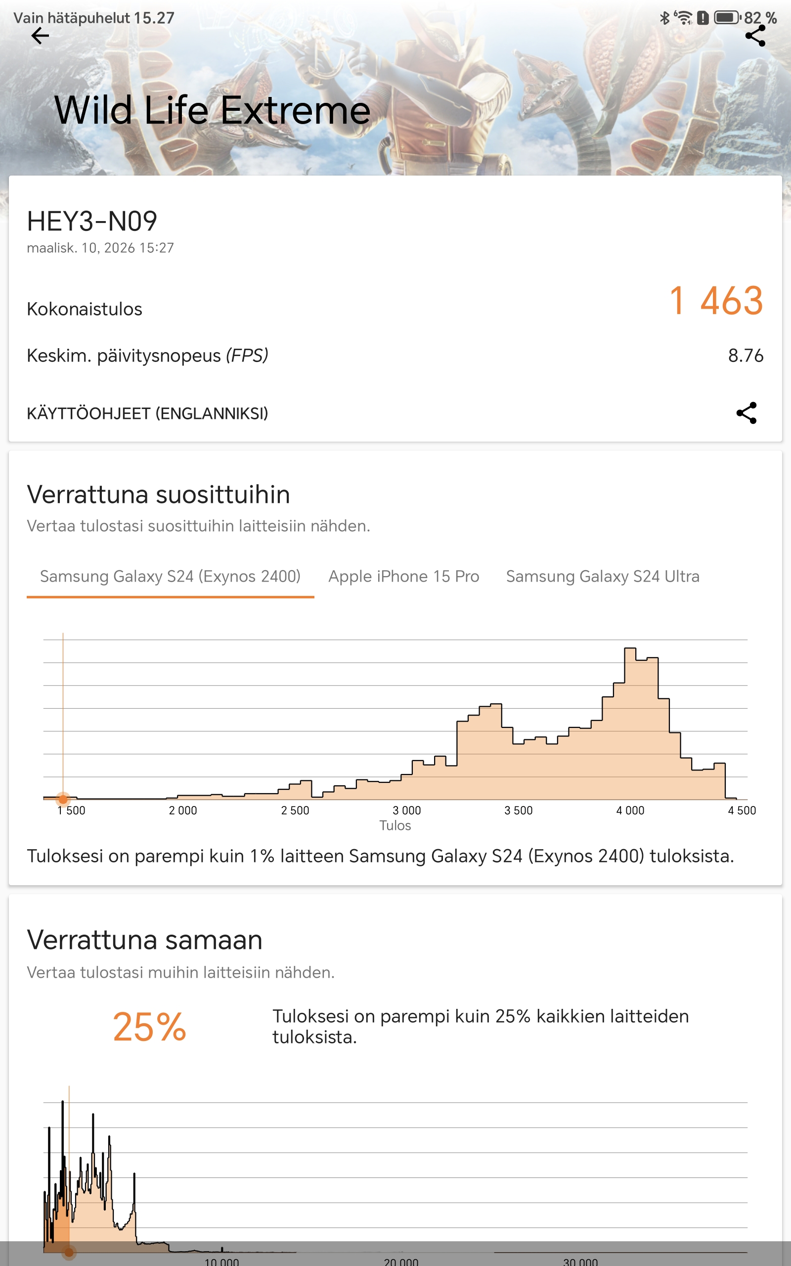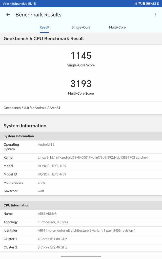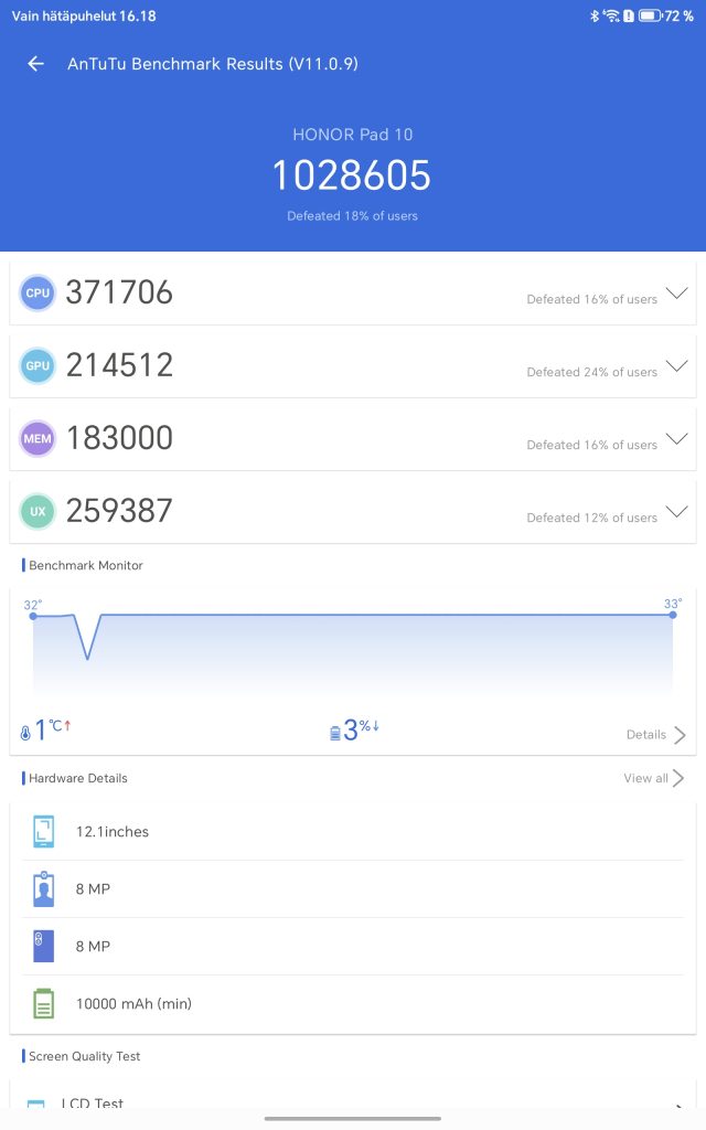 Suorituskykytestit antavat hyvän kuvan siitä, mihin Honor Pad 10 pystyy. AnTuTu-testissä kokonaispisteet asettuivat noin 1 028 605 pisteeseen, mikä on keskiluokan tabletille varsin odotettu tulos. Geekbench 6 -testissä laite saavutti 1145 pistettä yhden ytimen testissä ja 3193 pistettä moniydintestissä. Tulokset eivät riko ennätyksiä, mutta kertovat riittävästä suorituskyvystä suurimpaan osaan käyttötarpeista.