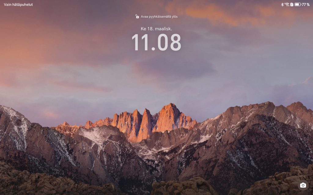 Etuosan 8 megapikselin kamera on käytännössä tärkeämpi, ja se on suunniteltu ennen kaikkea videopuheluita varten. Kamera on sijoitettu pitkälle sivulle, joten se toimii luontevasti vaakatasossa esimerkiksi Teams- tai Zoom-palavereissa. Tässä käytössä kuvanlaatu on täysin riittävä, ja kuva pysyy selkeänä normaalissa valaistuksessa.