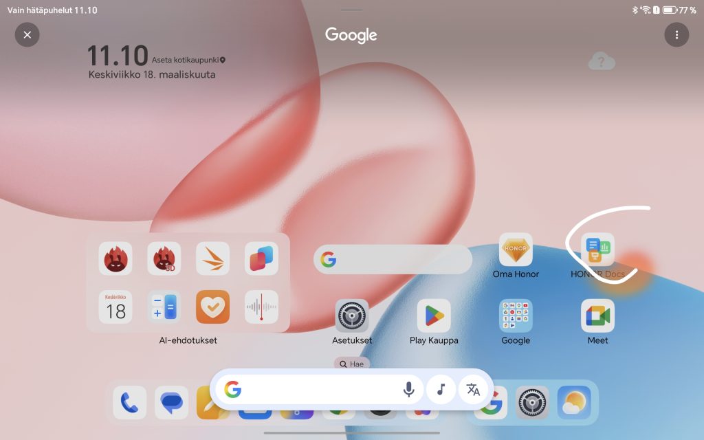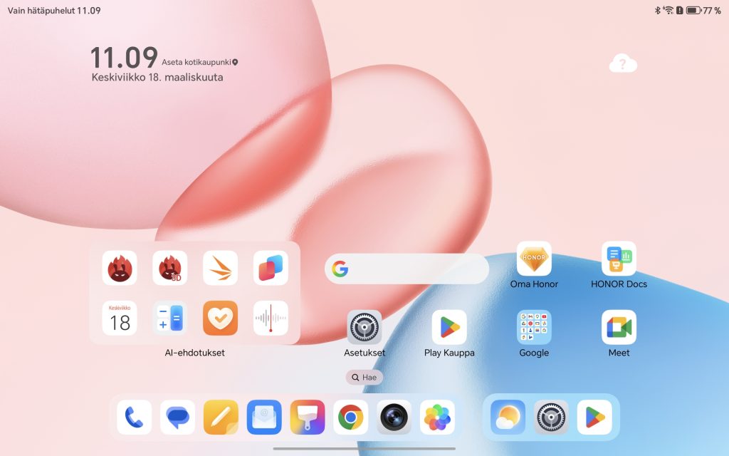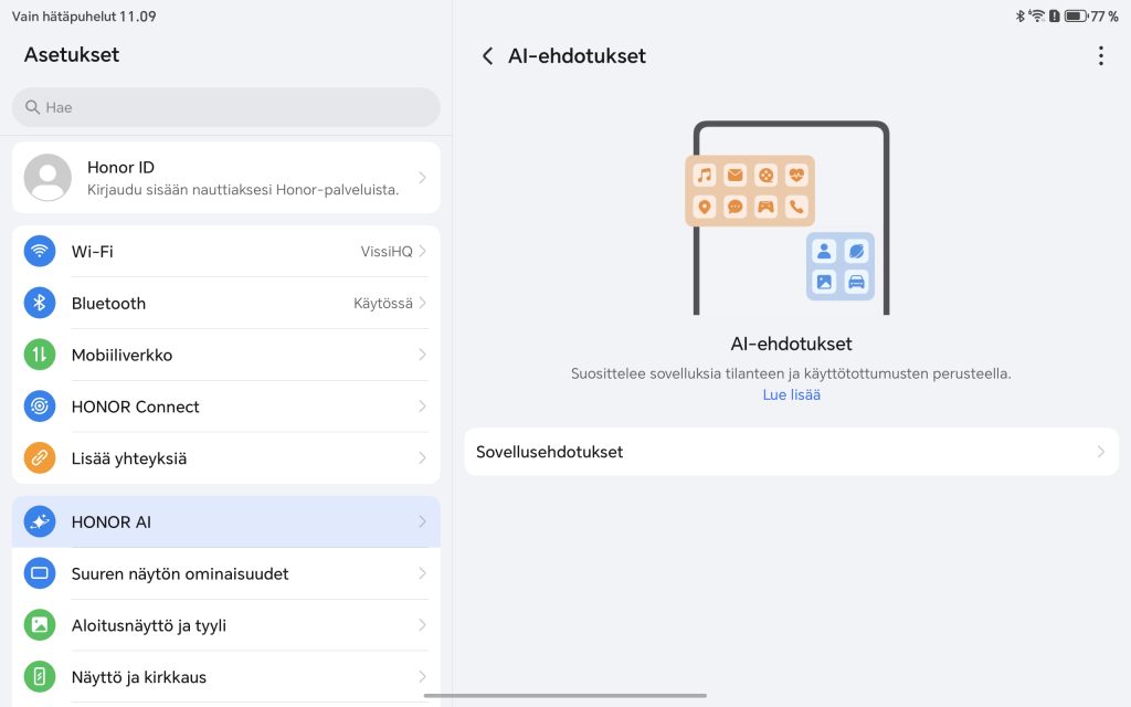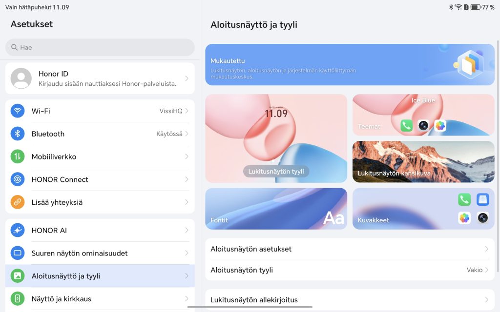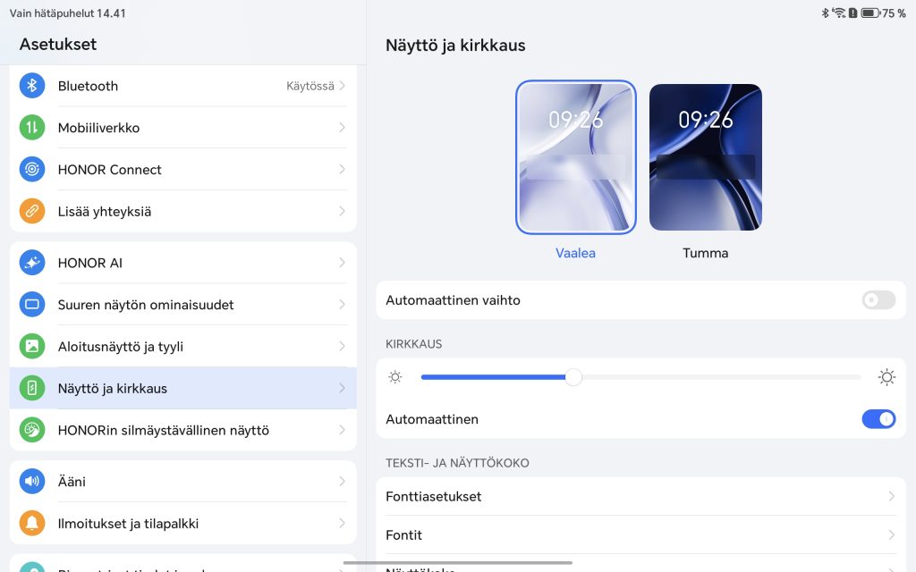 Honor Pad 10 toimitetaan Android 15 -käyttöjärjestelmällä ja valmistajan omalla MagicOS 9.0 -käyttöliittymällä. Ohjelmisto on viime vuosina kehittynyt selvästi, ja Pad 10:n kohdalla kokonaisuus tuntuu varsin kypsältä erityisesti tablettikäyttöä ajatellen. Toki jo näin vuoden 2026 alussa Android 15 on vanha ohjelmisto, eikä Honor ole saanut tabletille vieläkään uusinta Android 16 -versiota.