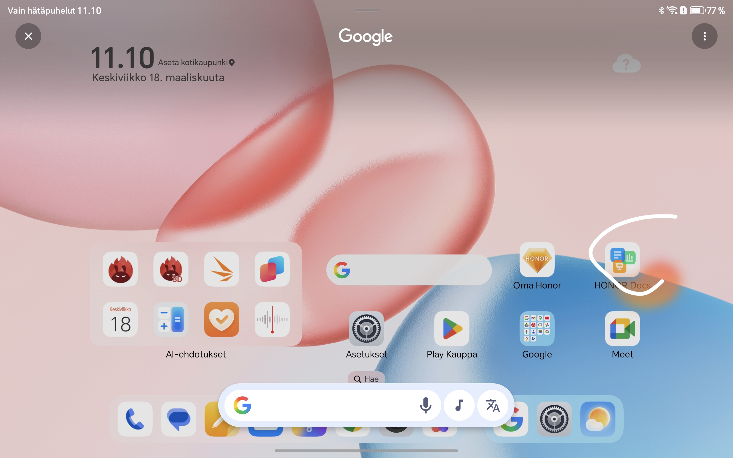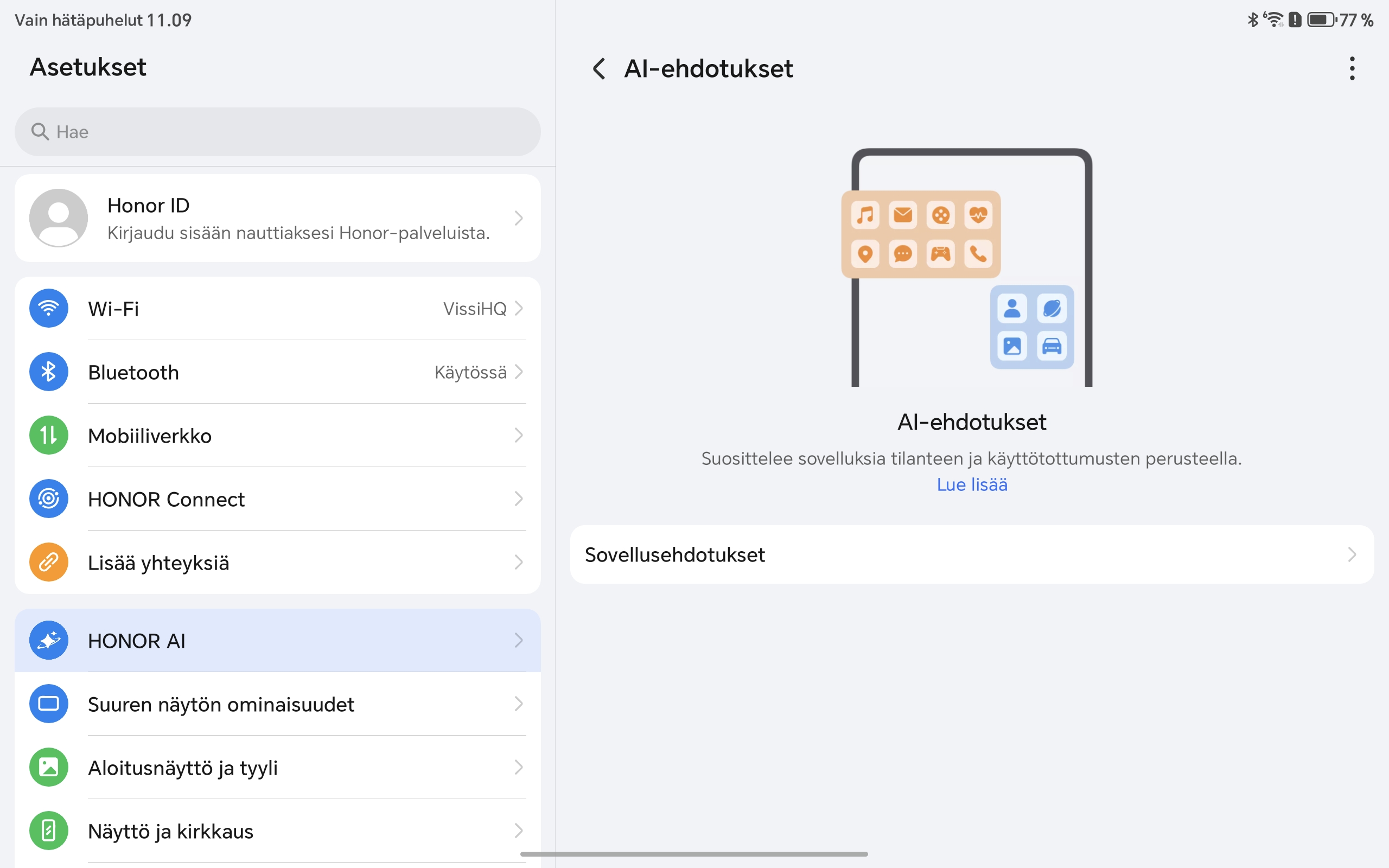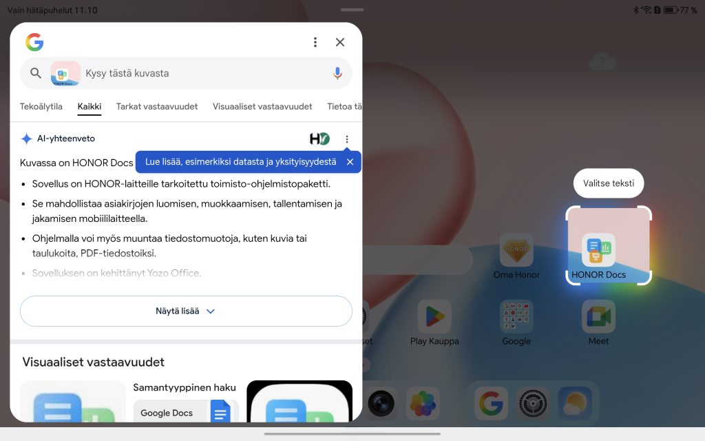 Honor Pad 10 toimitetaan Android 15 -käyttöjärjestelmällä ja valmistajan omalla MagicOS 9.0 -käyttöliittymällä. Ohjelmisto on viime vuosina kehittynyt selvästi, ja Pad 10:n kohdalla kokonaisuus tuntuu varsin kypsältä erityisesti tablettikäyttöä ajatellen. Toki jo näin vuoden 2026 alussa Android 15 on vanha ohjelmisto, eikä Honor ole saanut tabletille vieläkään uusinta Android 16 -versiota.