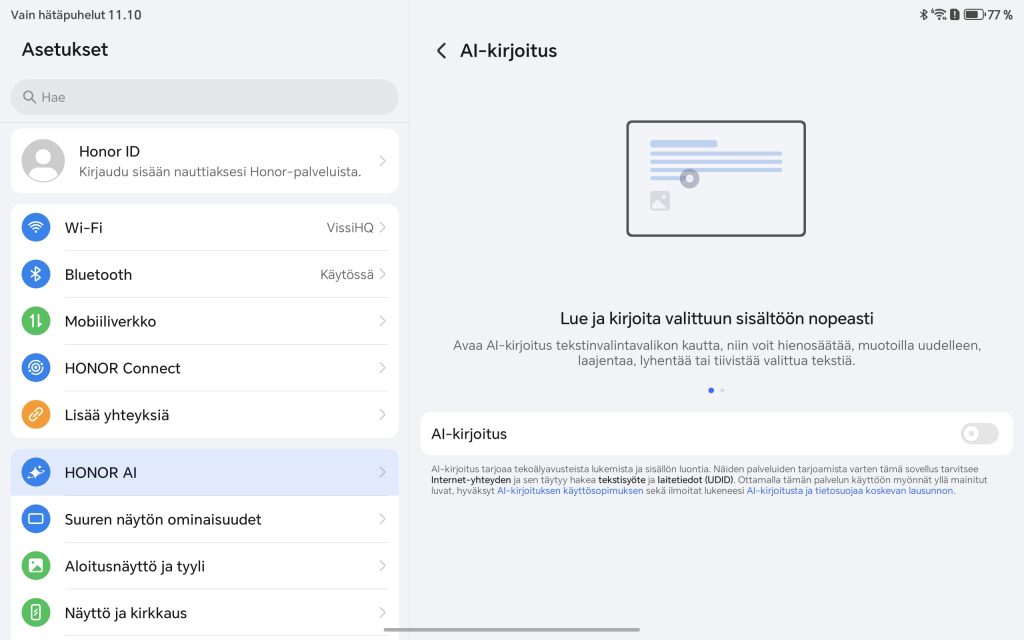 Tekoäly onkin vahvasti läsnä MagicOS-ohjelmistossa. Esimerkiksi AI Notes pystyy tekemään tekstiyhteenvedon pidemmistä sisällöistä, muokkaamaan tekstiä selkeämmäksi sekä jopa litteroimaan puhetta tekstiksi. Käytännössä nämä toimivat parhaiten englanniksi. Lisäksi tarjolla on AI Writing -työkalu, joka auttaa tekstin tuottamisessa ja muokkaamisessa.