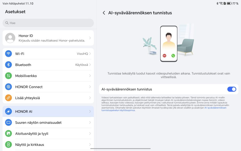 Lisäksi mukana on esimerkiksi AI-pohjainen deepfake-tunnistus videopuheluihin, reaaliaikainen puheentunnistus sekä käännöstoiminnot, jotka voivat olla hyödyllisiä erityisesti opiskelussa ja työssä. Honor tarjoaa myös laajat mahdollisuudet laitteiden väliseen yhteistyöhön Honor Connect -toiminnolla, jonka avulla tiedostojen siirto ja yhteistyö muiden laitteiden kanssa onnistuu jopa eri käyttöjärjestelmien välillä.