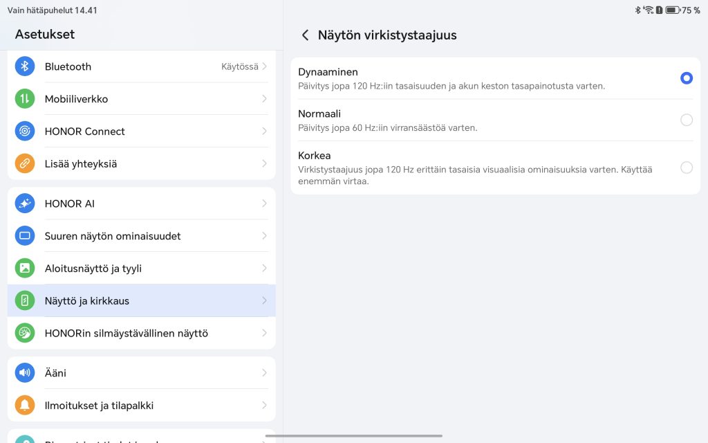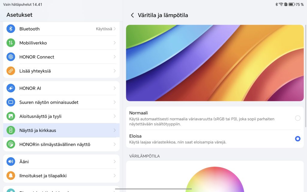 Vaikka OLED-paneelia ei nähdä, Honor on onnistunut valitsemaan kohtuullisen laadukkaan LCD-paneelin. Värit toistuvat tasapainoisesti ja luonnollisesti ilman liiallista ylikorostusta, mikä tekee näytöstä miellyttävän erityisesti pidempiaikaiseen käyttöön. Sävyissä on hienoista viileyttä oletusasetuksilla, mutta tämä on säädettävissä asetuksista. Mustan taso ei yllä OLED-näyttöjen syvyyteen, mutta kontrasti on LCD-paneeliksi hyvällä tasolla, eikä kuva tunnu latistuneelta.