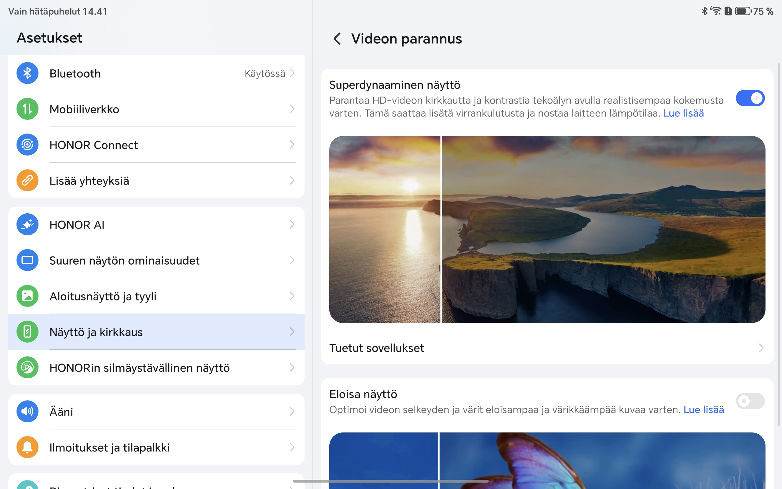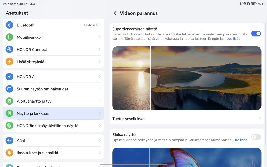 Honor on panostanut myös silmäystävällisyyteen. Näyttö ei hyödynnä PWM-himmennystä, mikä voi olla tärkeä yksityiskohta joillekin käyttäjille. Tarjolla on kuitenkin useita silmäystävällisiä ominaisuuksia, kuten sinivalosuodatin, dynaaminen himmennys sekä vuorokausirytmiin mukautuva näyttötila, jotka tekevät pitkästäkin käytöstä miellyttävämpää.