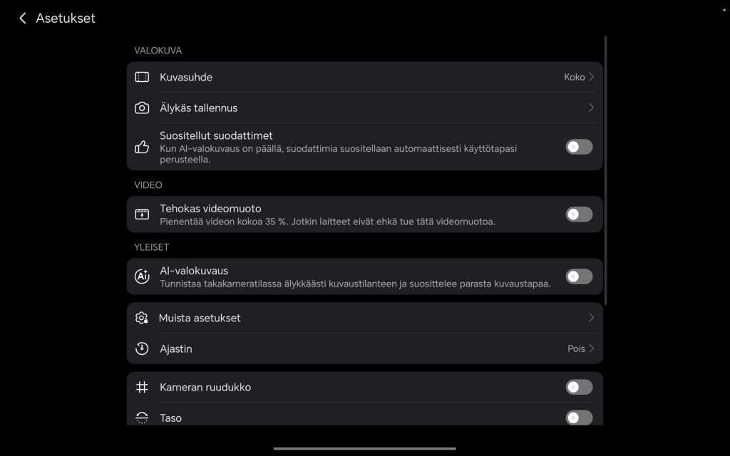 Tablettien kohdalla kamerat ovat lähes poikkeuksetta sivuroolissa. Takakamera on varustettu automaattitarkennuksella, ja se soveltuu parhaiten dokumenttien skannaamiseen, muistiinpanojen tallentamiseen tai nopeisiin tilannekuviin silloin, kun puhelin ei ole saatavilla.