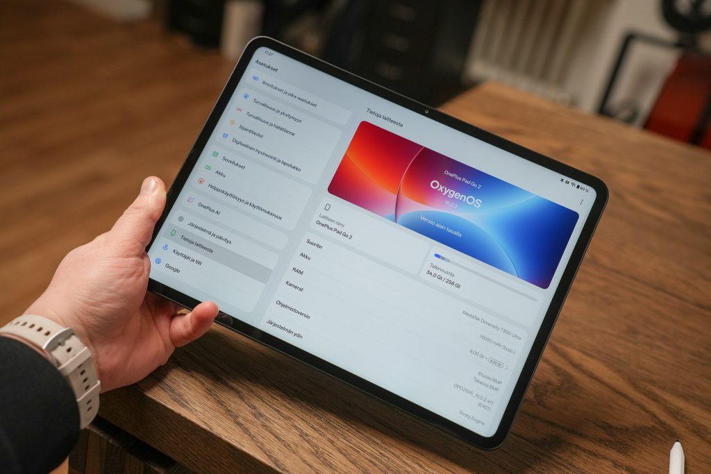 12,1 tuuman 7:5-kuvasuhteen näyttö toimii erinomaisesti moniajossa ja lukemisessa. Akunkesto on yksi tabletin selkeimmistä valttikorteista, sillä useamman päivän käyttö yhdellä latauksella tekee Pad Go 2:sta huolettoman laitteen. Ohjelmistopuolella OxygenOS 16, Open Canvas -moniajo sekä poikkeuksellisen pitkä päivityslupaus nostavat tabletin selvästi monien kilpailijoiden yläpuolelle.