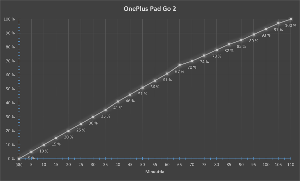 Testin perusteella OnePlus Pad Go 2 latautui tyhjästä täyteen noin 110 minuutissa. Lataus eteni tasaisesti koko prosessin ajan. Ensimmäisten 30 minuutin aikana akkua saatiin noin 30 prosenttia ja tunnin kohdalla varaustaso oli noussut noin 61 prosenttiin. Latauksen loppupäässä tahti hidastui hieman, kuten tämän kokoisella akulla on odotettavissa, mutta kokonaisuutena latausnopeus on täysin linjassa laitteen akun kapasiteetin kanssa.