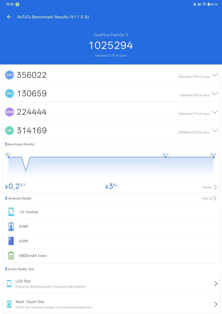 Suorituskyvyn osalta ei ole tarjolla siis yllätyksiä, ja sen huomaa helposti OnePlus Pad Go 2:ssa ajetuista suorituskykytesteistä. Tulokset ovat alapuolella nähtävissä kuvakaappauksien muodossa.