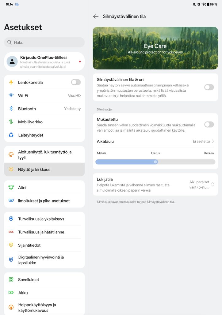 OnePlus Pad Go 2 tukee myös Dolby Vision -tekniikkaa, mikä on tässä hintaluokassa edelleen harvinaista. Widevine L1 -sertifikaatti mahdollistaa teräväpiirtoisen sisällön toiston yhteensopivissa palveluissa, kuten Netflixissä. Näytön asetuksista löytyy tuttuja OnePlussan ratkaisuja, kuten väriprofiilien säätö, värilämpötilan hienosäätö sekä silmäystävällinen tila pidempää käyttöä varten.