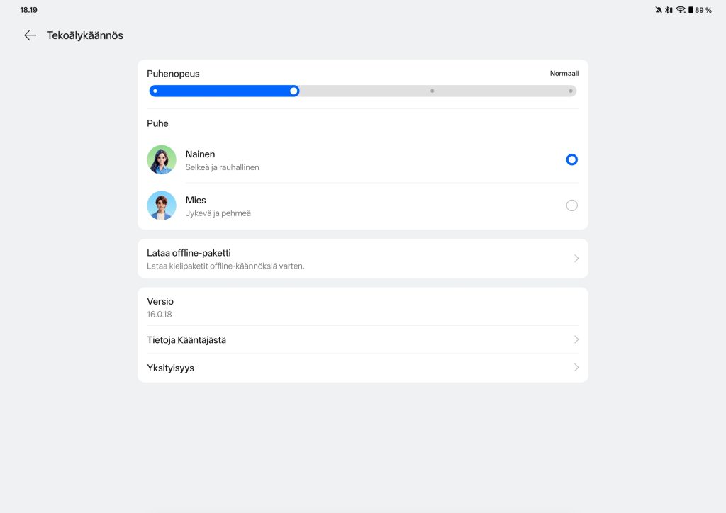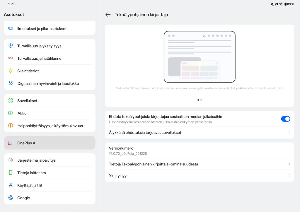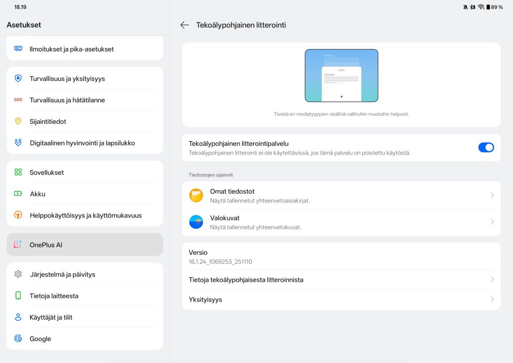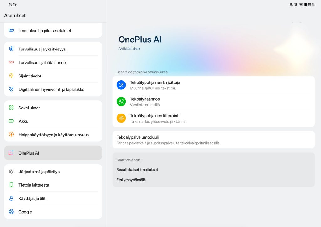 OxygenOS 16 tuo mukanaan myös joukon tekoälytoimintoja, joita OnePlus kutsuu OnePlus AI -kokonaisuudeksi. Näihin kuuluvat muun muassa AI Writer tekstien muokkaamiseen ja viimeistelyyn, AI Recorder puheen litterointiin sekä useat tekoälypohjaiset kuvankäsittelytyökalut, kuten AI Eraser ja AI Unblur. Lisäksi tarjolla ovat AI Translate ja AI Summary, joiden avulla pitkiä tekstejä voidaan tiivistää tai kääntää nopeasti. Käytännössä tekoälytoiminnot ovat hyödyllisimpiä silloin, kun tabletin kieli on englanti, sillä suomenkielinen tuki on vielä rajallista.