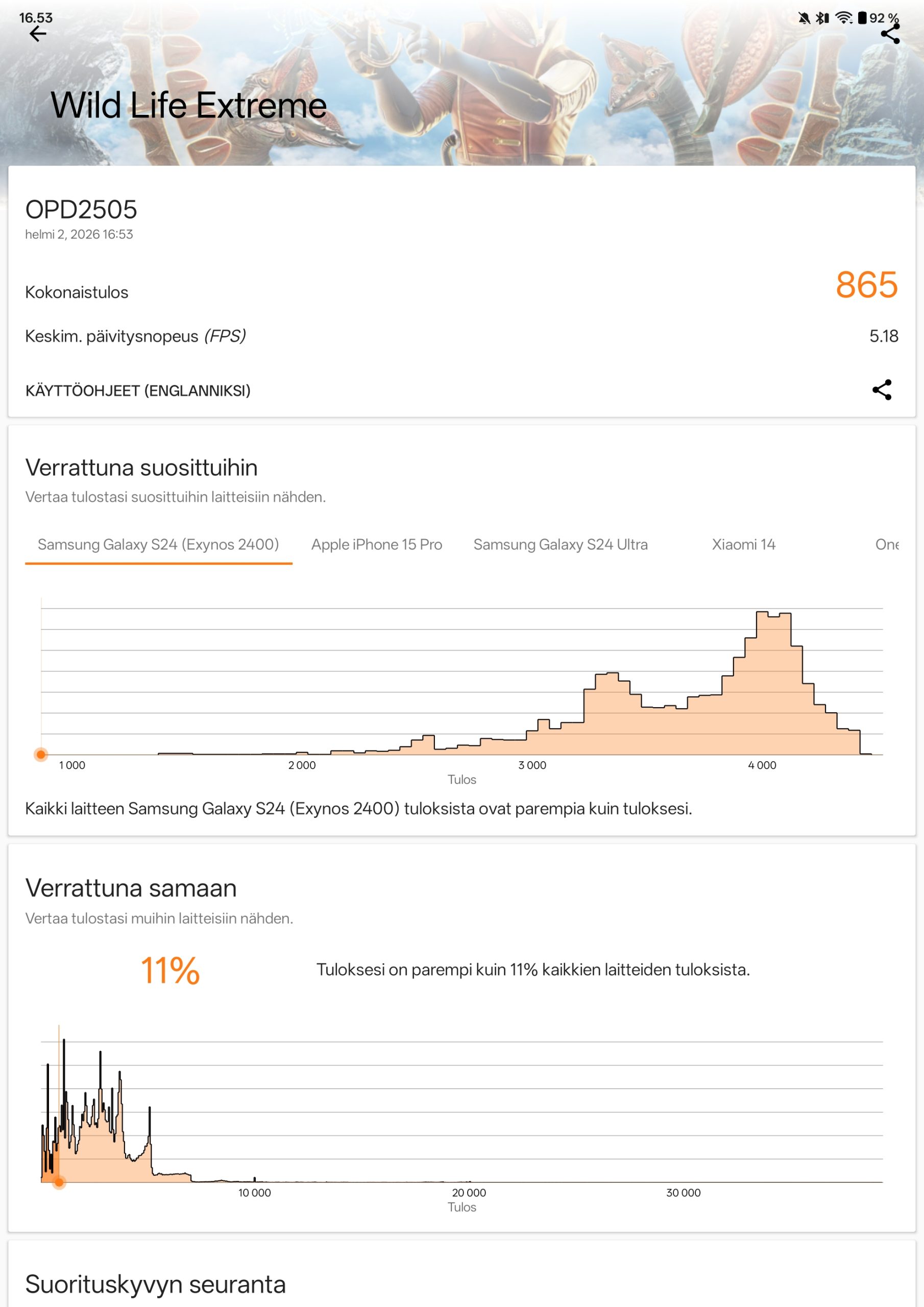 Suorituskyvyn osalta ei ole tarjolla siis yllätyksiä, ja sen huomaa helposti OnePlus Pad Go 2:ssa ajetuista suorituskykytesteistä. Tulokset ovat alapuolella nähtävissä kuvakaappauksien muodossa.