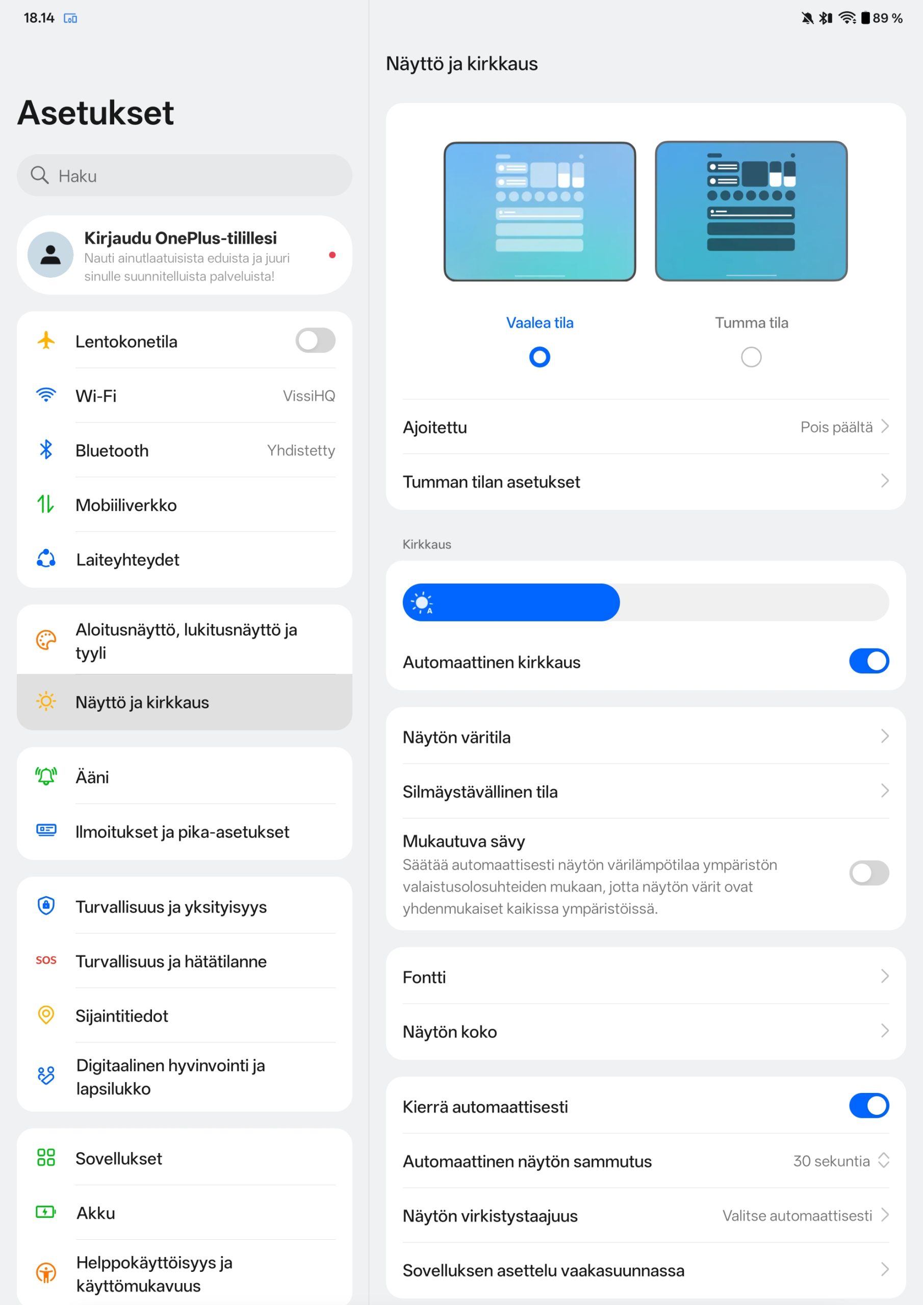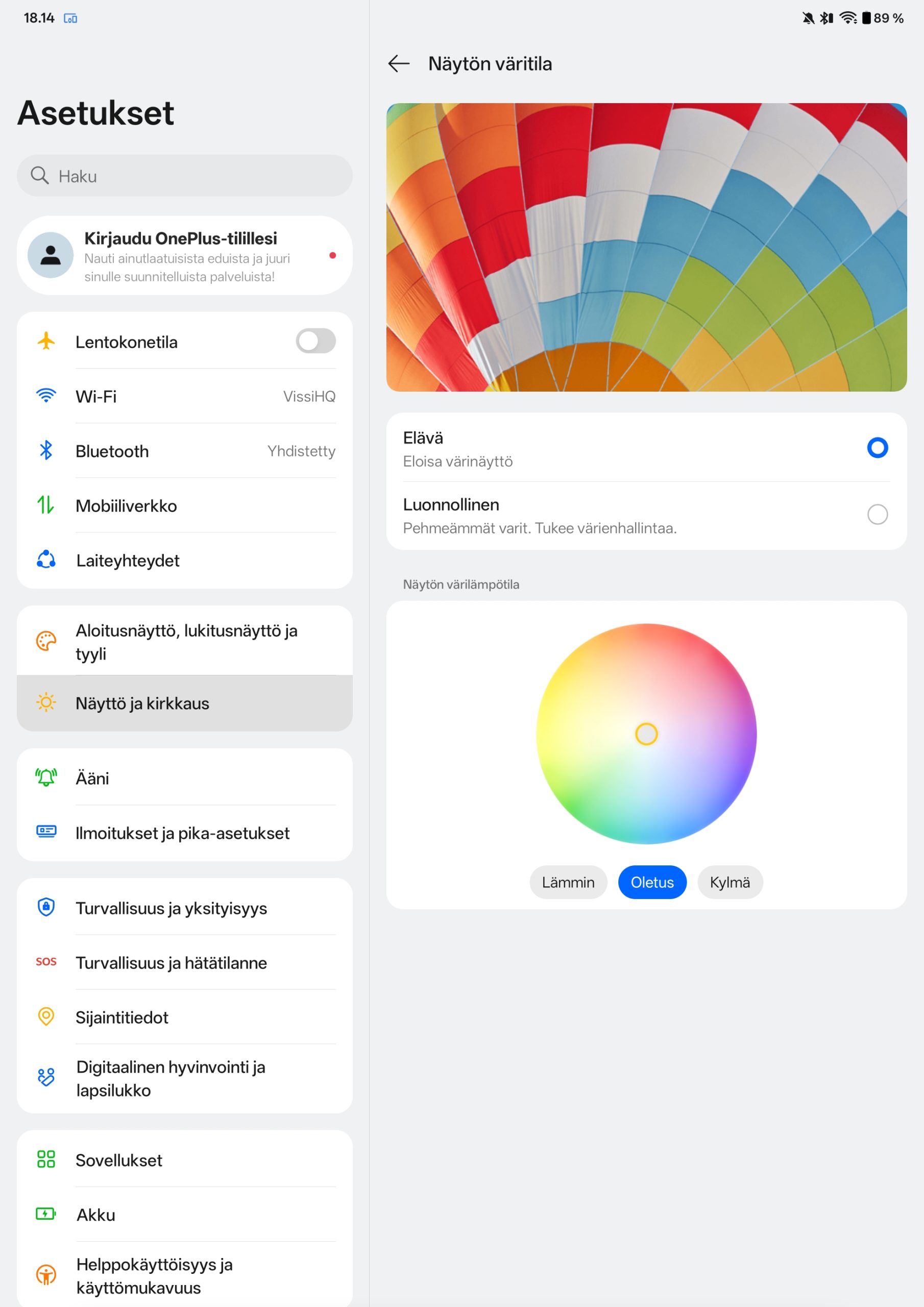 OnePlus Pad Go 2 tukee myös Dolby Vision -tekniikkaa, mikä on tässä hintaluokassa edelleen harvinaista. Widevine L1 -sertifikaatti mahdollistaa teräväpiirtoisen sisällön toiston yhteensopivissa palveluissa, kuten Netflixissä. Näytön asetuksista löytyy tuttuja OnePlussan ratkaisuja, kuten väriprofiilien säätö, värilämpötilan hienosäätö sekä silmäystävällinen tila pidempää käyttöä varten.