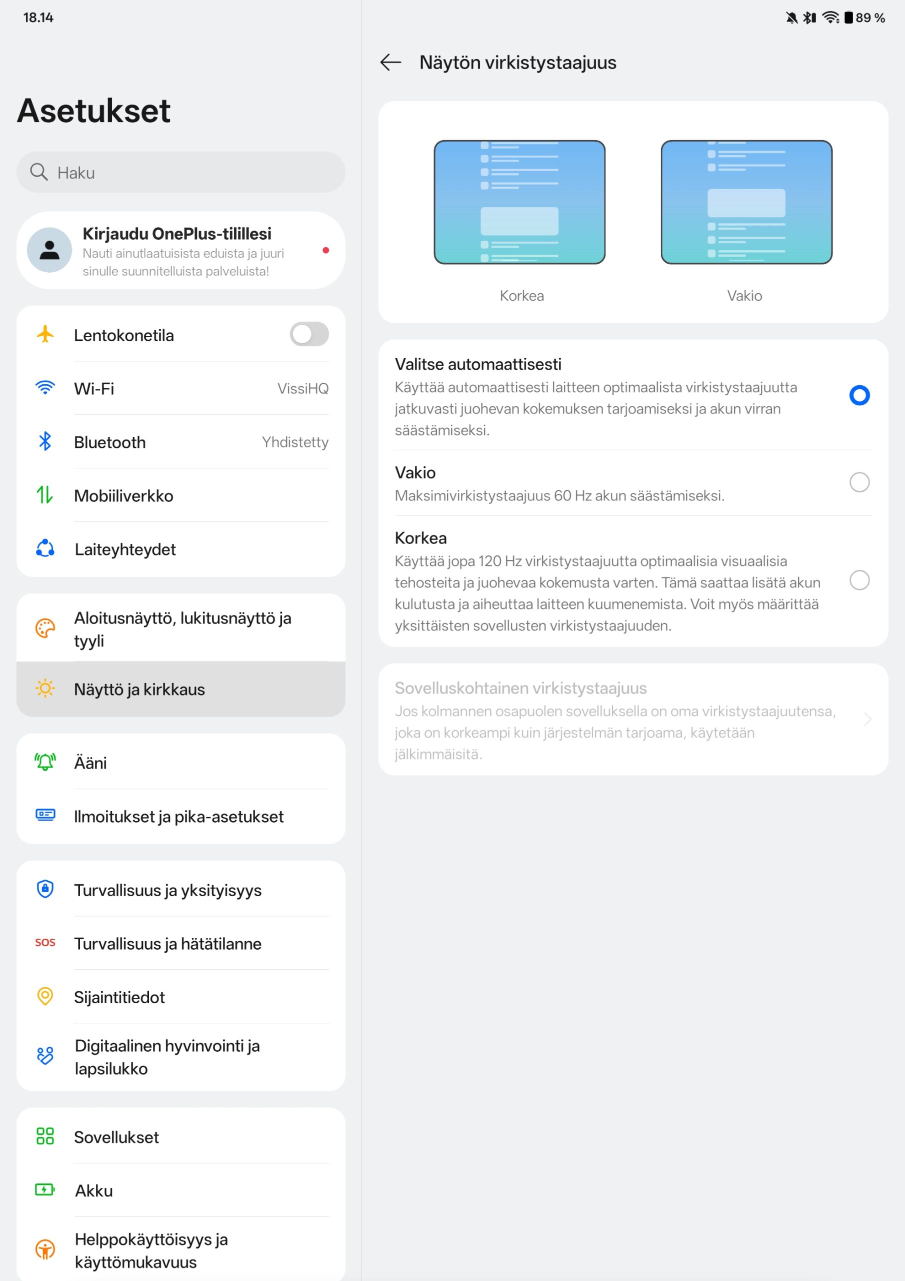 Näytön virkistystaajuus yltää 120 hertsiin, mikä tekee selailusta, sovellusten välillä siirtymisestä ja yleisestä käytöstä sulavaa. OnePlus tukee porrastettua virkistystaajuutta, joten näyttö voi laskea taajuutta sisällön mukaan esimerkiksi 60 tai 90 hertsiin, mikä auttaa myös virrankulutuksen hallinnassa.