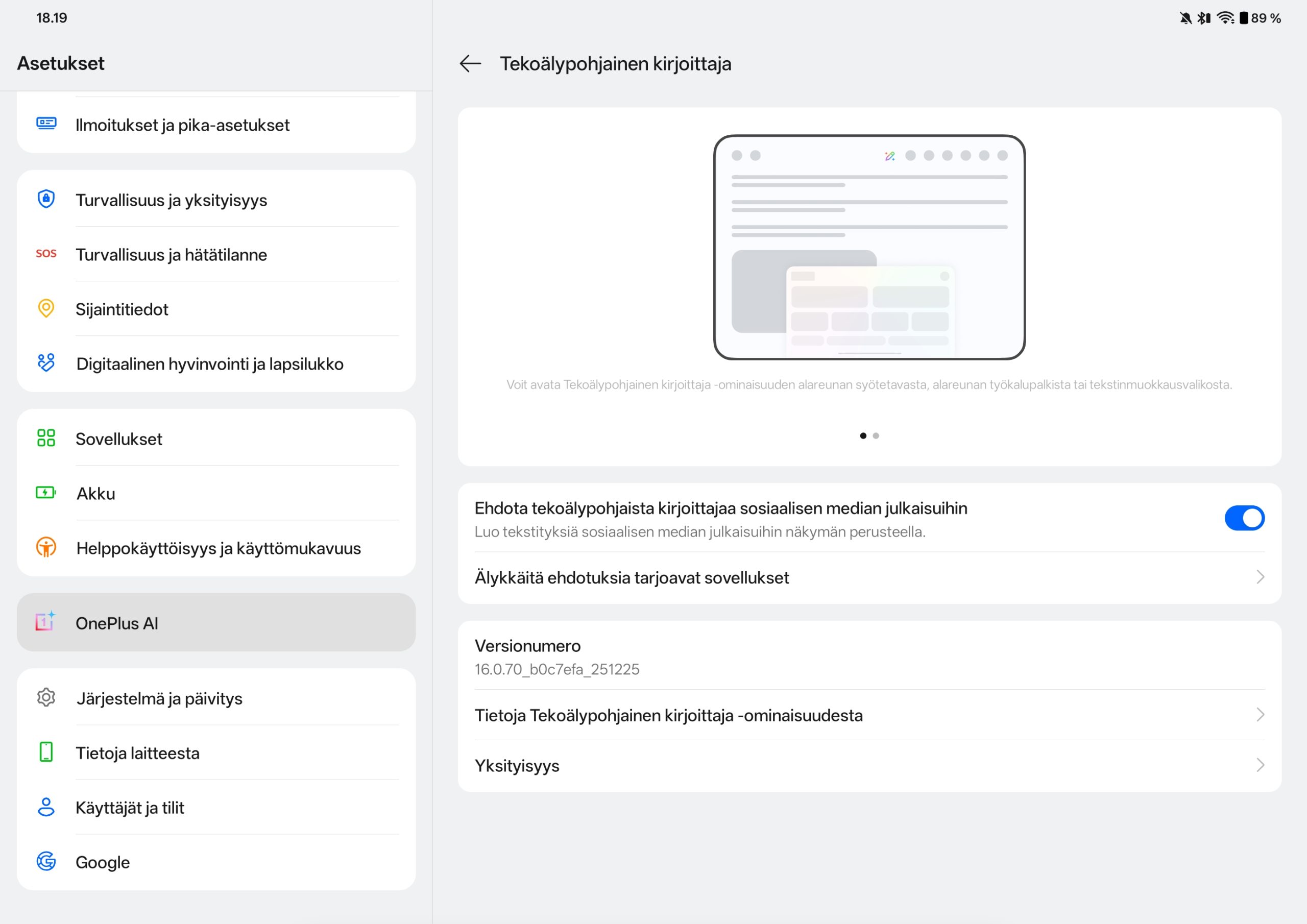 OxygenOS 16 tuo mukanaan myös joukon tekoälytoimintoja, joita OnePlus kutsuu OnePlus AI -kokonaisuudeksi. Näihin kuuluvat muun muassa AI Writer tekstien muokkaamiseen ja viimeistelyyn, AI Recorder puheen litterointiin sekä useat tekoälypohjaiset kuvankäsittelytyökalut, kuten AI Eraser ja AI Unblur. Lisäksi tarjolla ovat AI Translate ja AI Summary, joiden avulla pitkiä tekstejä voidaan tiivistää tai kääntää nopeasti. Käytännössä tekoälytoiminnot ovat hyödyllisimpiä silloin, kun tabletin kieli on englanti, sillä suomenkielinen tuki on vielä rajallista.