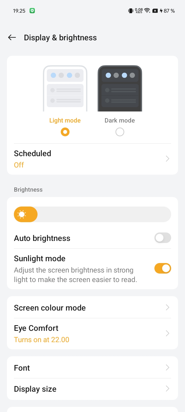 Silmäystävällinen tila vähentää näytön sinistä väriä ja tarjoaa aikataulutuksen, värilämpötilan säätämiseen tarkoitetun liukusäätimen, jonka avulla näyttön värilämpötilaa voidaan muuttaa neutraalin ja lämpimän välillä. Samaisessa asetusvalikossa on vaihtoehto mustavalkoiselle näytölle.