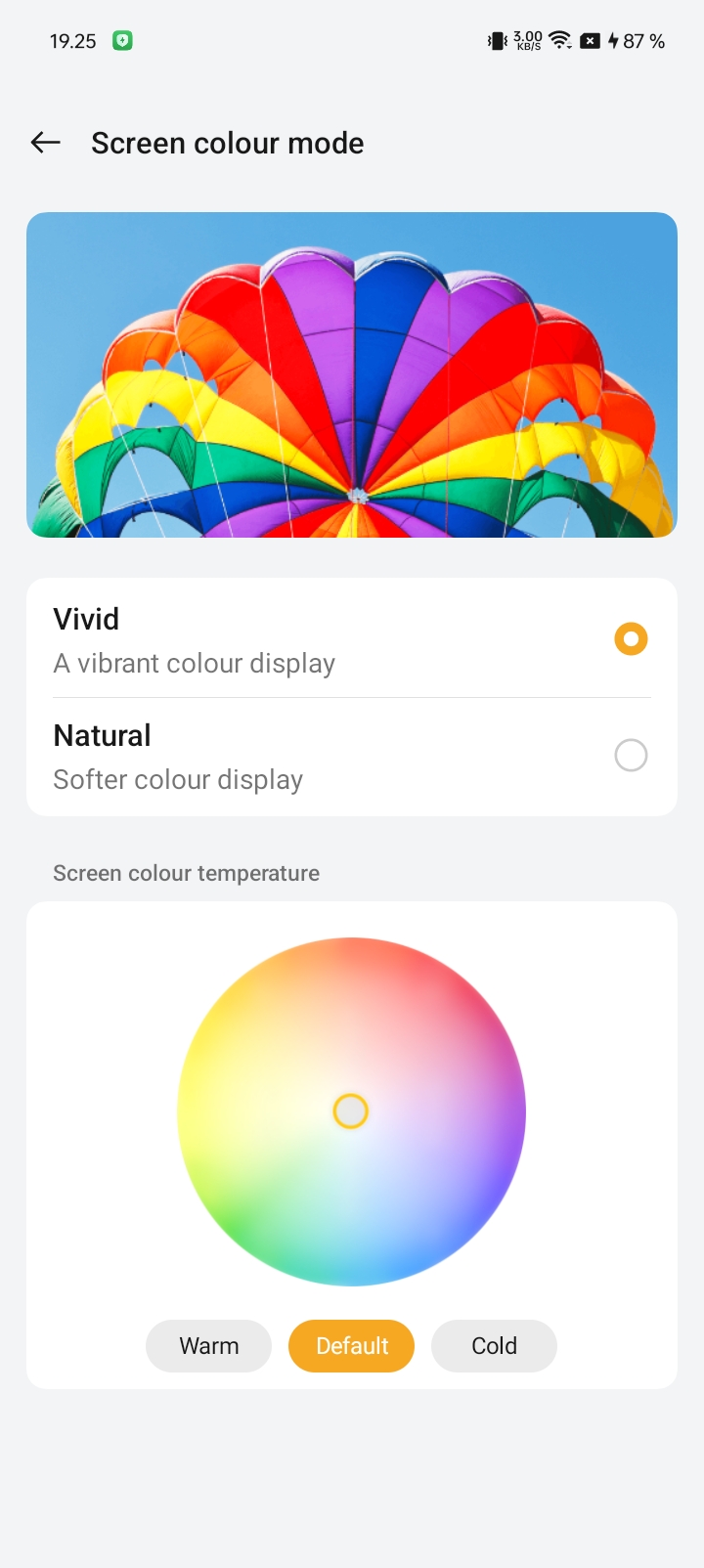 Oppo antaa käyttäjälle laajasti mahdollisuuksia kustomoida näytön eri osa-alueita. Näytön asteuksista löytyy vakio-ominaisuudeksi lueteltava väriensäätö. “Elävä” -asetus tuo näyttöön enemmän värejä verrattuna “luonnolliseen”, joka puolestaan vähentää näytön värejä ja tekee kuvasta luonnollisemman. Näiden lisäksi ohjelmisto tarjoaa manuaalisen värilämpötilan säätämisen, jonka lisäksi tarjolla on kolme vakioasetusta: kylmä, oletus sekä lämmin.
