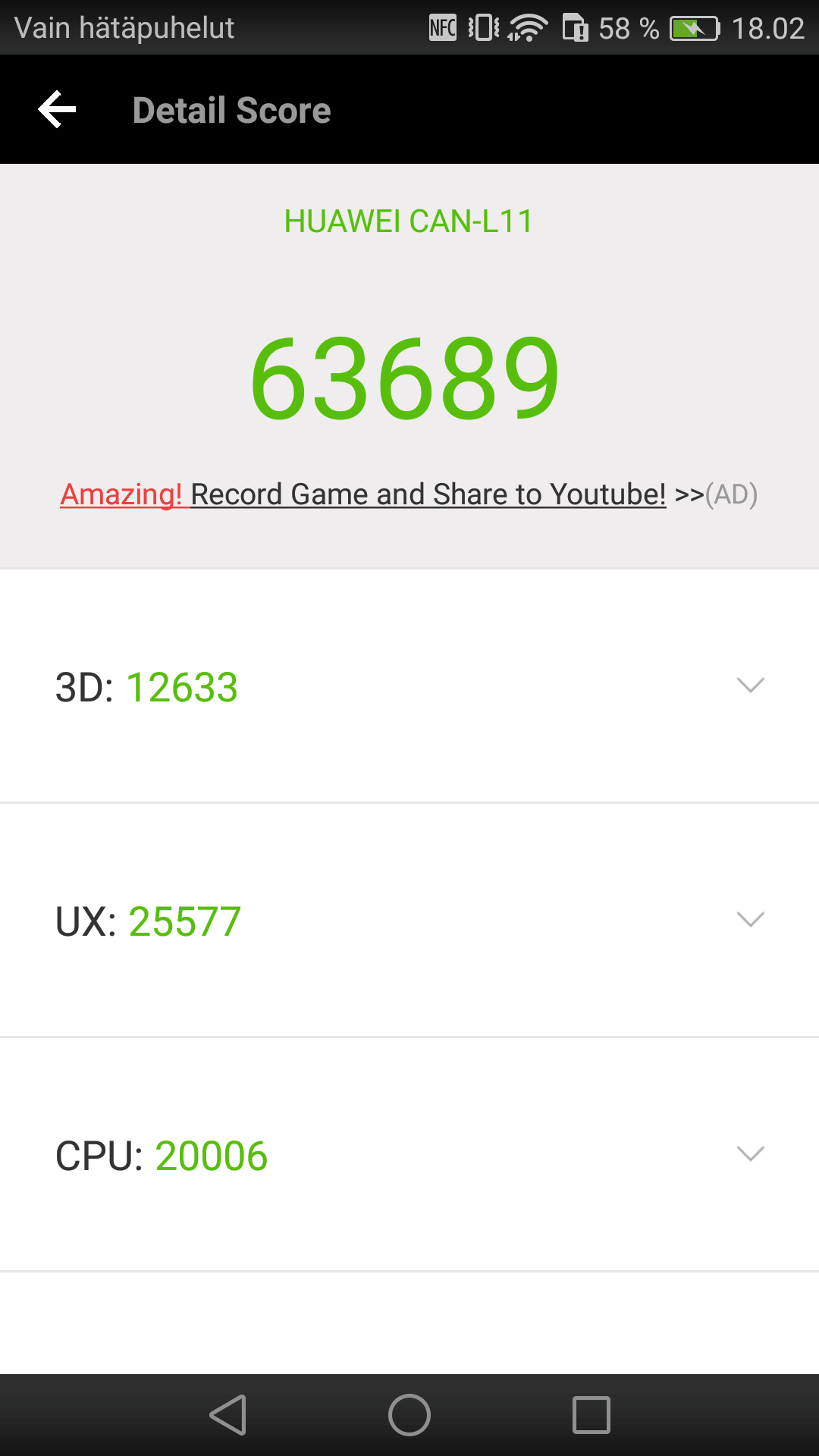 Tehoiltaan Huawei Nova ei ole kovinkaan erikoinen, mutta ajaa varmasti asiansa. Ajoimme puhelimessa läpi tutut Geekbench 4 ja AnTuTu -suorituskykytestit, jotka antoivat kohtuulliset tulokset, eikä eroa juurikaan ole verrattua kilpailijoiden vastaavan hintaluokan puhelimiin. AnTuTu antoi Novalle 63 689 pistettä.
