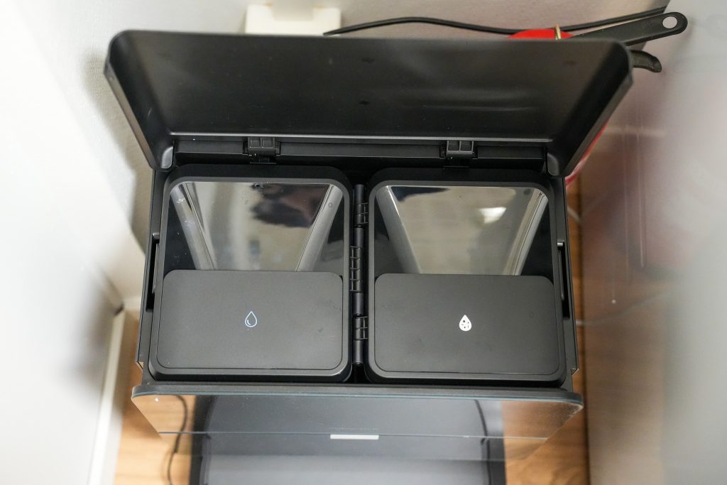 Telakassa on lisäksi erilliset vesisäiliöt. Sisuksista paljastuu neljän litran puhdasvesisäiliö ja kolmen litran likavesisäiliö, jotka on helppo irrottaa ja täyttää. Roborock suosittelee käyttämään omaa pesuainettaan, mutta myös muiden yhteensopivien aineiden käyttö toimii ongelmitta. Imurin mukana ei tule pesuainetta, joten se on ostettava itse. Itse käytin ihan lähimarketista löytyvää perinteistä lattianpuhdistusainetta ja se toimi hyvin.