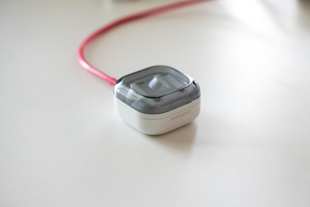 Latauspuolella Samsung pelaa varman päälle, sillä mukana on USB-C-portti, mutta tärkeämpänä monelle toimii langaton lataus, joka löytyy kompaktista kotelosta. Kuulokkeet voi siis heittää suoraan Qi-laturille ilman johtojen kanssa säätämistä.