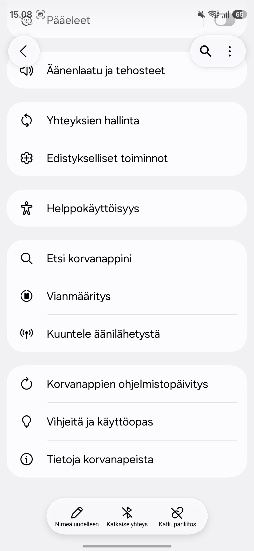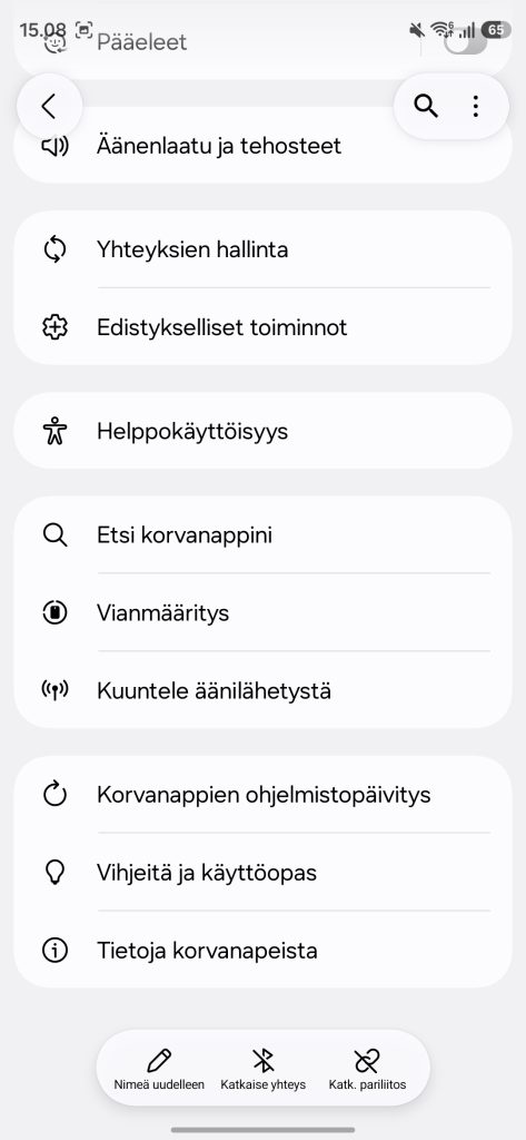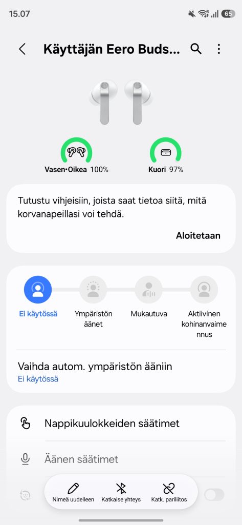 Samsungin omassa ekosysteemissä homma toimii parhaimmillaan. Monet toiminnot, kuten melunvaimennuksen säätö tai kuulokkeiden nopea yhdistäminen löytyvät suoraan puhelimen käyttöjärjestelmästä ilman, että sovellusta tarvitsee edes avata. Tämä tekee käytöstä sujuvaa, mutta vain Galaxy-laitteilla.