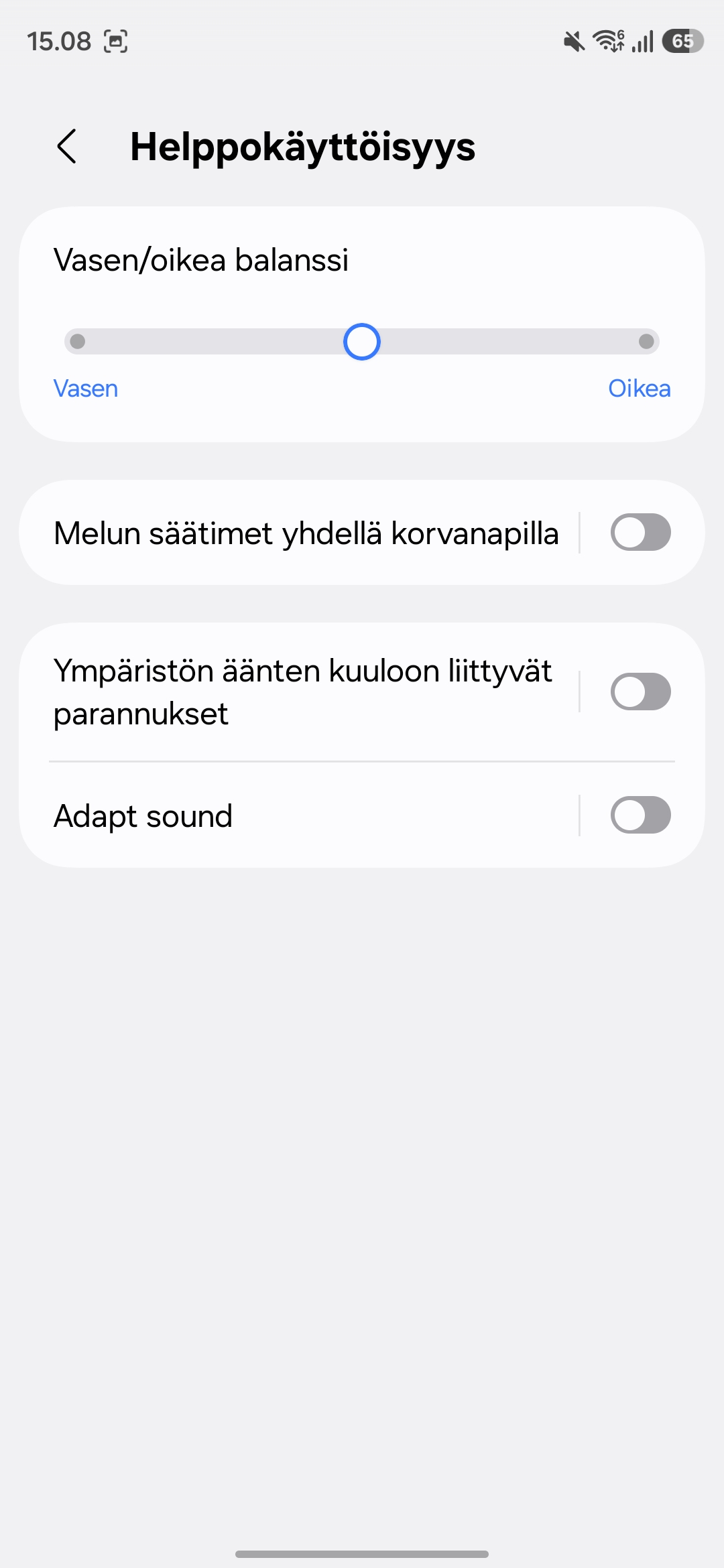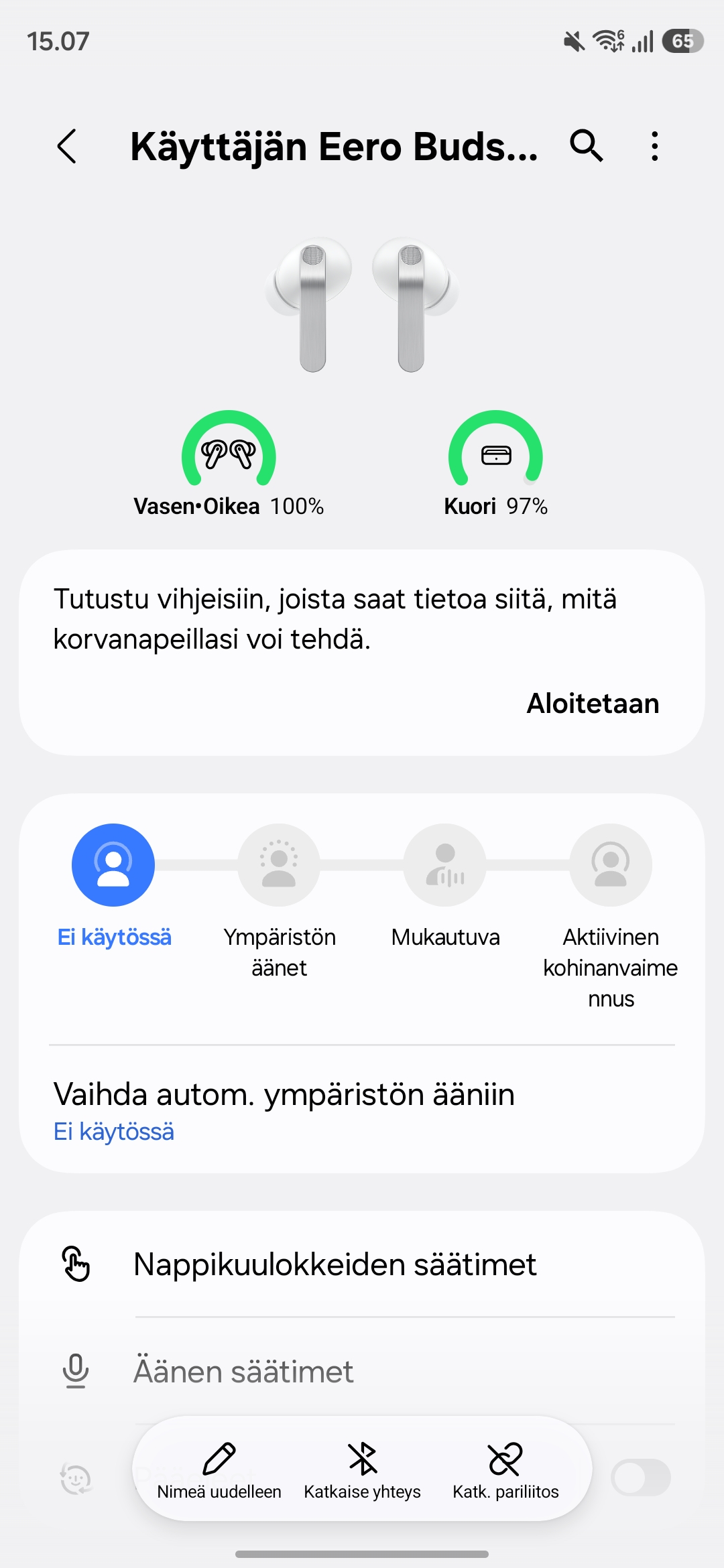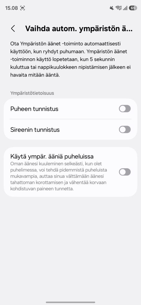 Melunvaimennuksen osalta Galaxy Buds 4 Pro tarjoaa useita eri tiloja, ja kokonaisuus toimii vakuuttavasti. Täysi aktiivinen melunvaimennus pehmentää tehokkaasti ympäristön hälyä, kuten liikenteen kohinaa tai kaupungin yleistä huminaa. Täydellistä hiljaisuutta ei saavuteta, mutta ero ilman melunvaimennusta on selkeä. Itse tykkäsin käyttää melunvaimennusta esimerkiksi junassa ja kaupassa, jolloin musiikin taustalta ei enää muuta melua kuulunut.