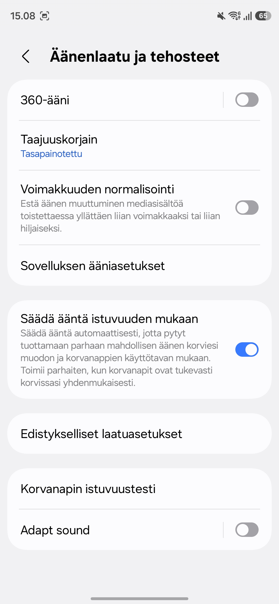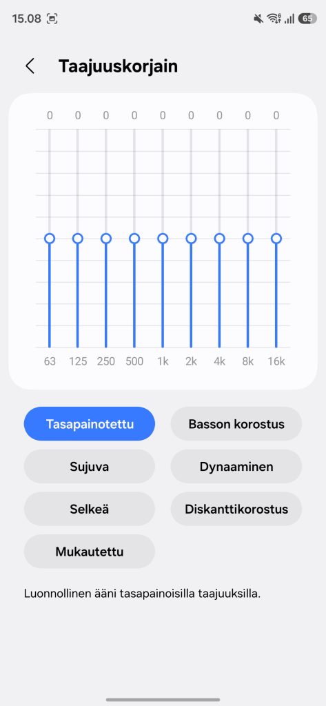 Sovelluksen puolella tarjolla on kuitenkin paljon säätövaraa, äänelle voi tehdä omia taajuuskorjainsäätöjä tai käyttää valmiita profiileja, ja tarjolla on myös esimerkiksi kuulokekohtainen äänen optimointi oman kuulon mukaan. Lisäksi mukana on tilaääni päänseurannalla, joka tuo musiikkiin ja videoihin lisää tilan tuntua. Kyseessä ei ole itselle välttämätön ominaisuus, mutta parhaimmillaan ihan toimiva lisä.