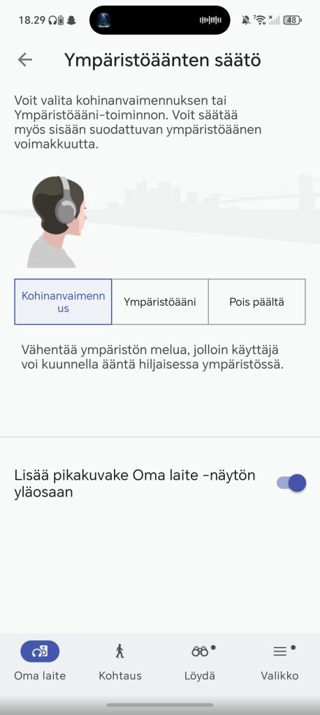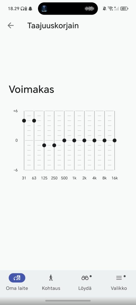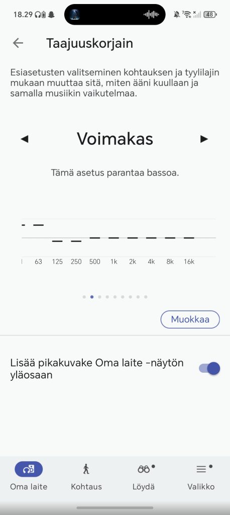 Sony tarjoaa myös monipuoliset äänen säätömahdollisuudet. Kuulokkeissa on sovelluksen kautta muokattava 10-kaistainen taajuuskorjain, jonka avulla ääntä voi hienosäätää oman mieltymyksen mukaan. Taajuuskorjaimen käyttö on helppoa ja tuo selvästi lisäarvoa etenkin käyttäjille, jotka haluavat muokata äänen profiilia tarkemmin.