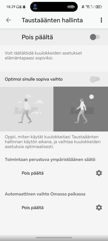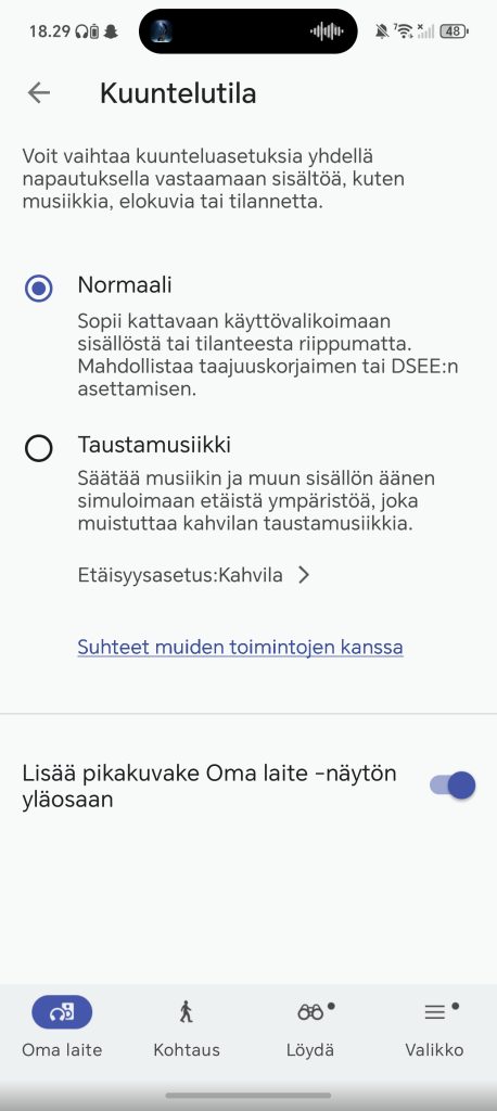 Mukana on myös taustamusiikkiefekti, joka luo vaikutelman etäämmältä tulevasta äänestä ja sopii esimerkiksi rennompaan kuunteluun tai keskittymistä vaativiin tilanteisiin. Itselle tämä ominaisuus oli vain hauska kokeilu, eikä se sopinut minulle päivittäistä käyttöä varten.