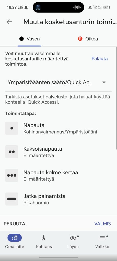Kummallekin kuulokkeelle voidaan määrittää omat toiminnot, kuten melunvaimennuksen vaihtaminen, musiikin ohjaus tai äänenvoimakkuuden säätö. Kosketusohjaus toimi testijakson aikana luotettavasti eikä häiritseviä virhepainalluksia esiintynyt.