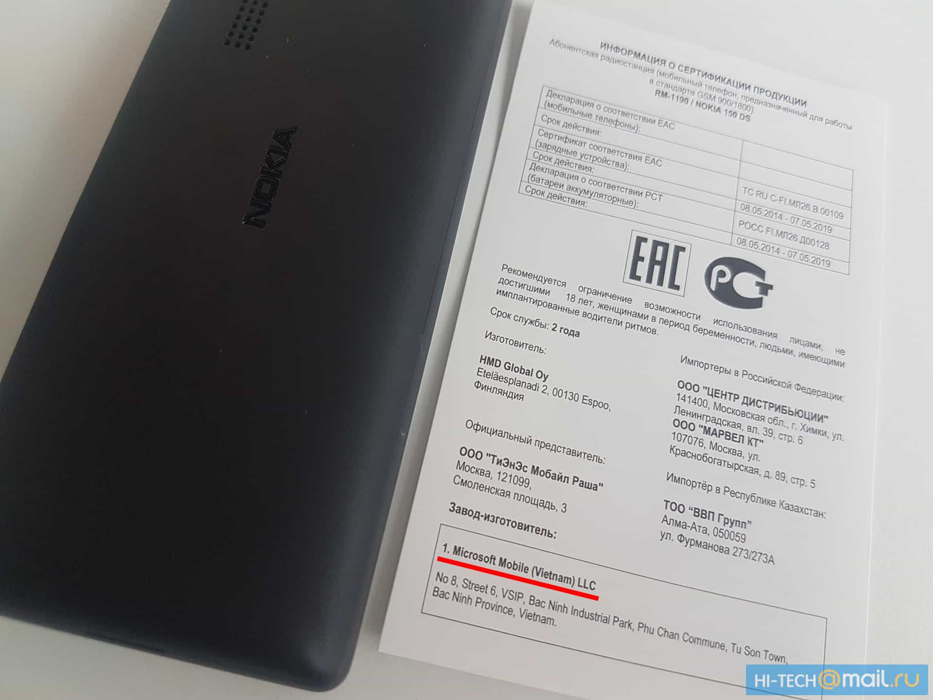 Nokia 150:n myynti on alkanut hiljattain myös Venäjällä ja sivusto on saanut sen testiinsä, mutta puhelin herätti kuitenkin hämmennystä. Puhelimen mukana toimitettavasta dukumentista käy ilmi, että puhelin on valmistettu Microsoft Mobile Vietnamin tehtaalla. Oikeastaan tämä ei ole yllätys, sillä viime vuoden kesällä tehdyn kaupan mukana FIH Mobile Ltd. osti Microsoft Mobile Vietnamin ja sen mukana kyseisen tehtaan. Hämmennystä herättää myös se, että HMD Global on päättänyt laittaa pakettiin mukaan myös Microsoftin tuotemerkin alla olevan laturin, joka on taasen valmistettu Kiinassa.