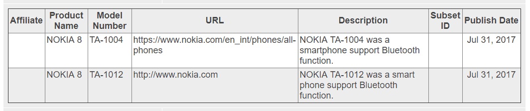 GFXBench tosin kertoo, että kyseessä olisi aikaisemmin huhuttu Nokia 9, mutta esimerkiksi Bluetooth-sertifikaatti kumoaa tämän väitteen. Sertifikaatin mukaan ainakin mallit TA-1004 ja TA-1012 ovat lopullisilta nimiltänsä Nokia 8.
