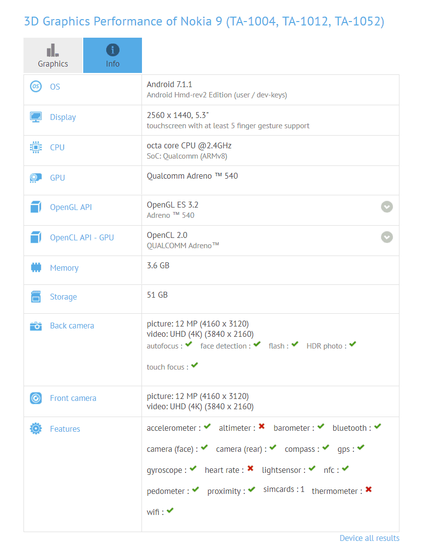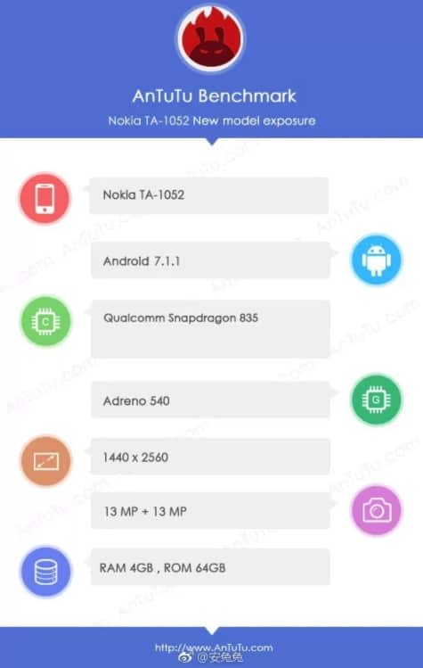GFXBenchin listaus kertoo, että Nokia 8:sta on olemassa ainakin kolme versiota, jotka ovat TA-1004, TA-1012 ja TA-1052. AnTuTu:n tietokannasta löytyy tietoja vain TA-1052 -mallista, GFXBench sekä AnTuTu antavat hyvin samanlaisia tietoja puhelimesta. Nokia 8:ssa on Android 7.1.1 -käyttöjärjestelmä, Qualcomm Snapdragon 835 -järjestelmäpiiri, 5,3 tuuman näyttö 1440 x 2560 pikselin tarkkuudella sekä 4 gigatavua RAM-muistia. Sisäistä tallennustilaa on 64 gigatavua ja puhelimen etu- ja takakamerat ovat suuruudeltaan 13 megapikseliä. Takakamera koostuu kahdesta 13 megapikselin kennosta, joista toisen odotetaan olevan mustavalkoinen.