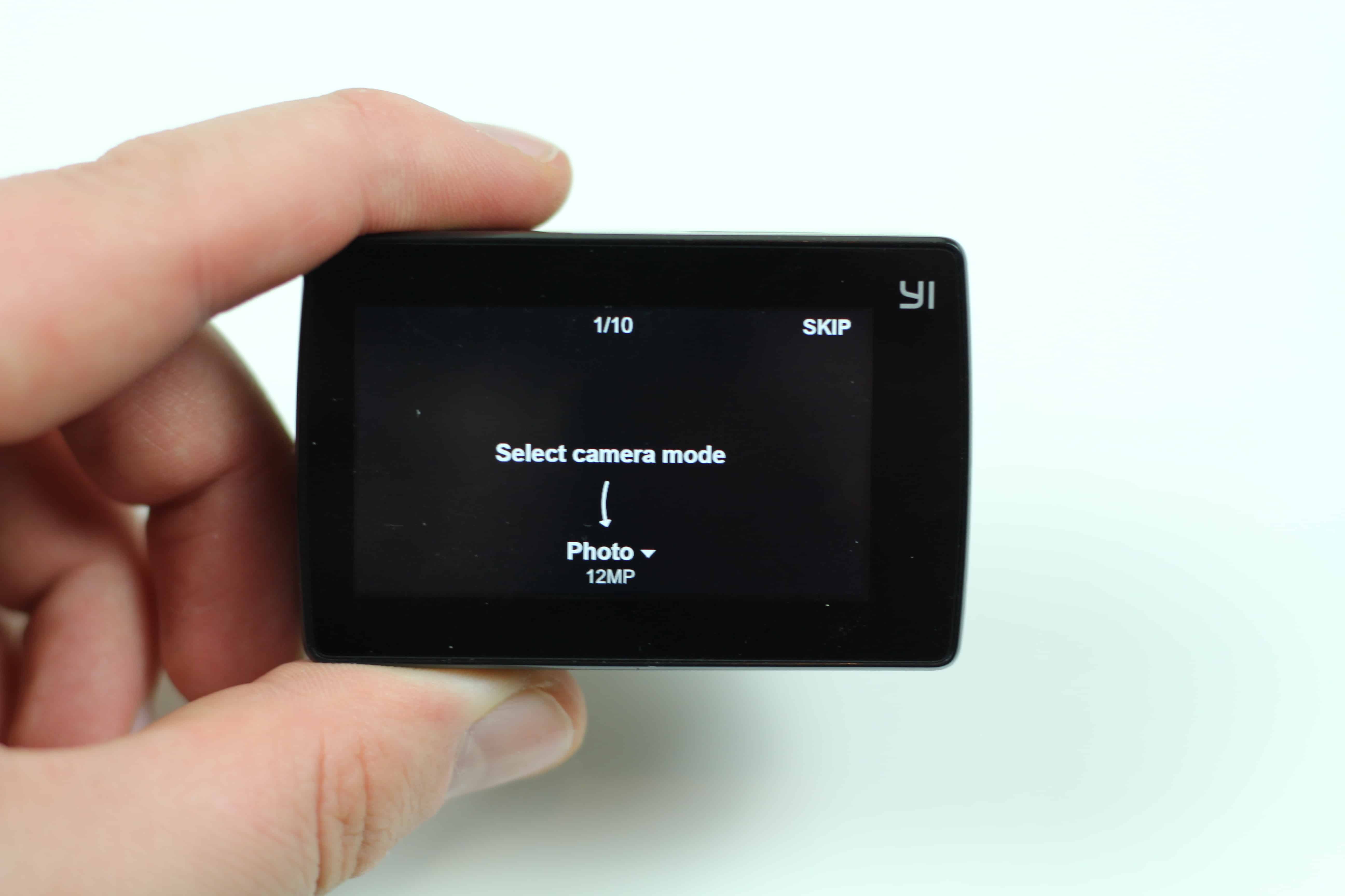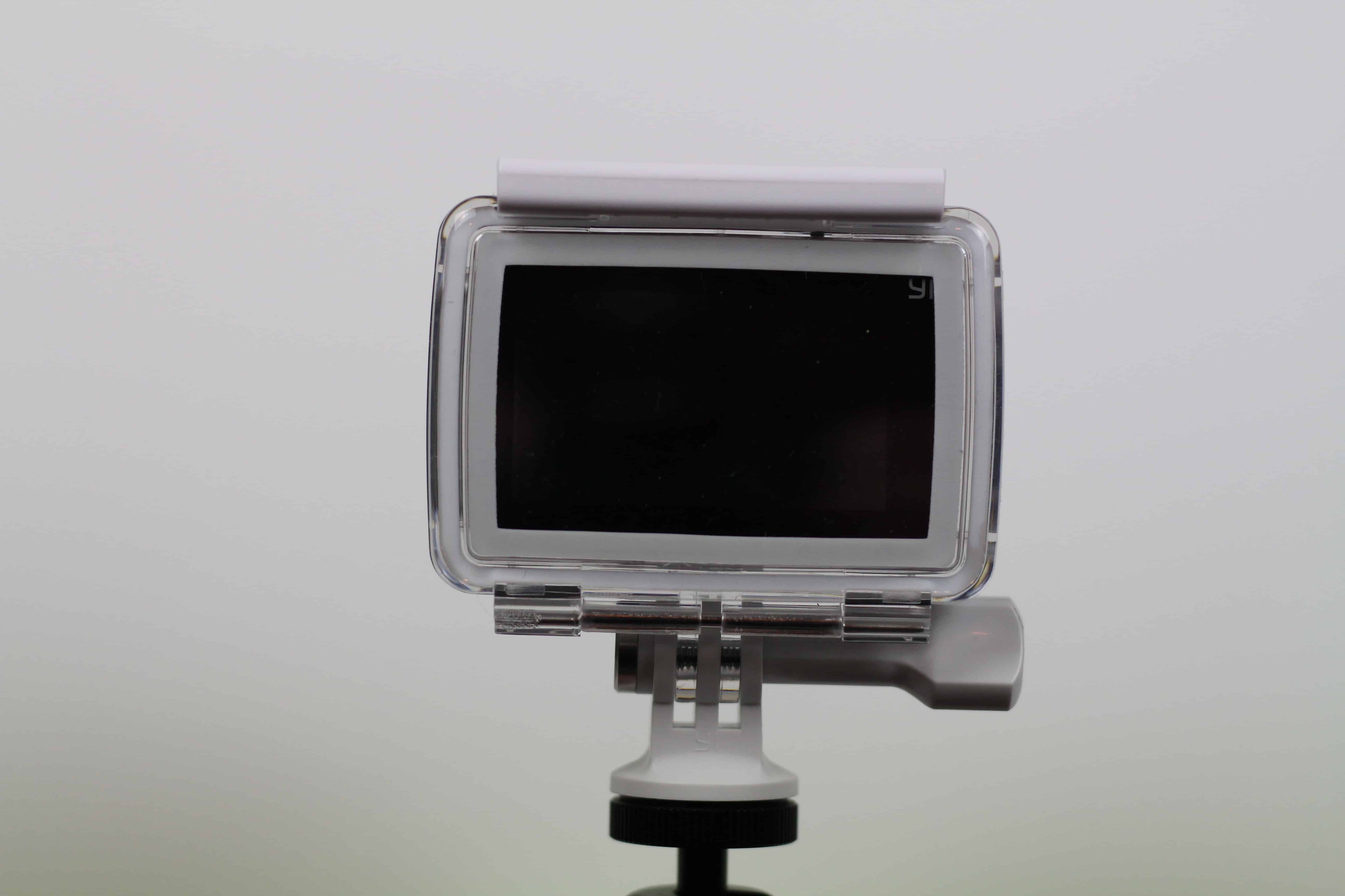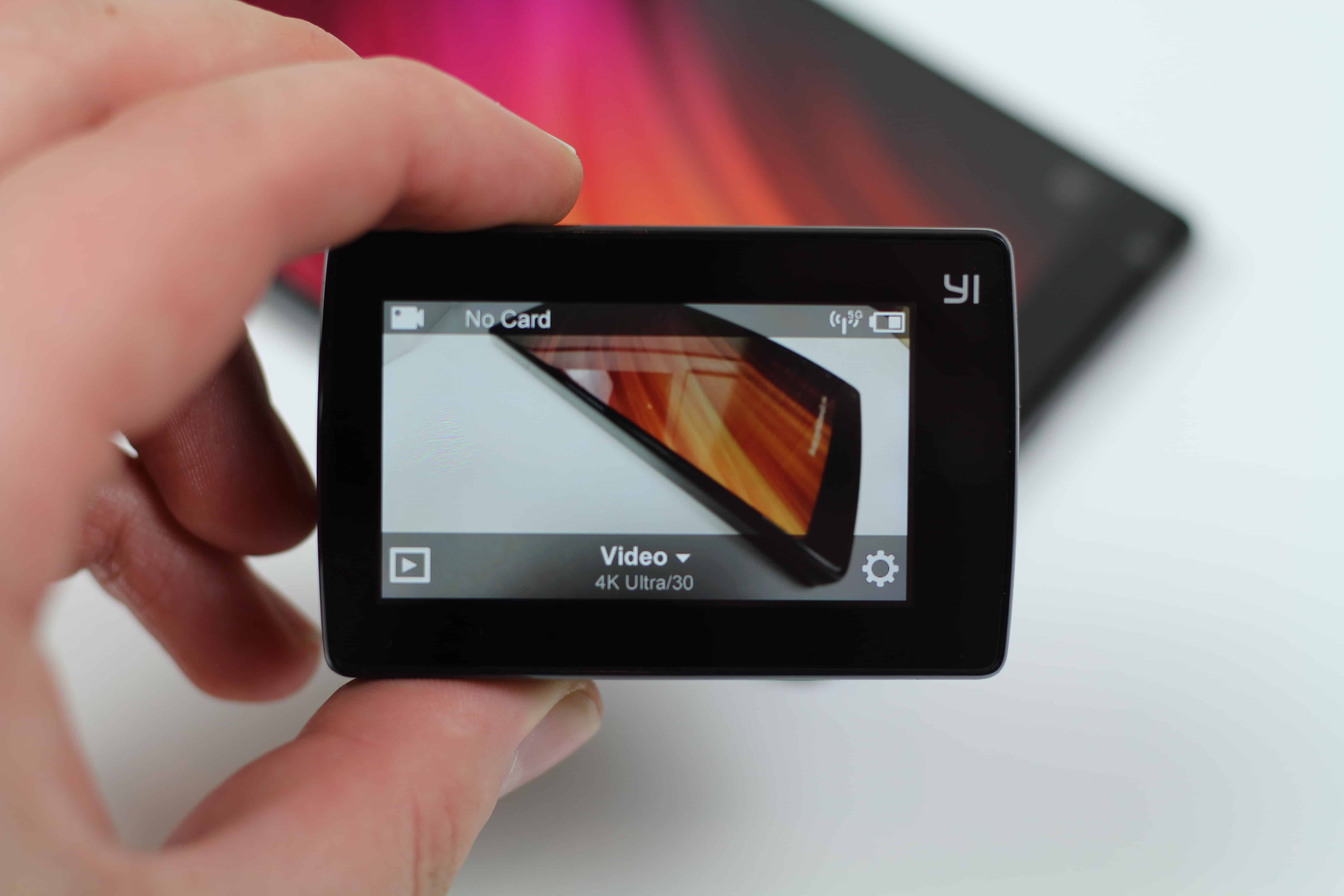 Kameran takana on 2.19 tuuman kosketusnäyttö, joka tekee laitteesta todella helppokäyttöisen. Resoluutio on 640 x 360 pikseliä. Pikselien määrä saattaa tuntua todella pieneltä, mutta yhdistettynä näin pieneen näyttöön kuva on riittävän tarkkaa (330ppi). Näyttöä on suojaamassa Gorilla Glass -lasi, joka suojaa hyvin naarmuilta vaativimmissakin kuvaustilanteissa. Laitteen pohjasta löytyy luukku, jonka alta löytyy paikka akulle sekä muistikortille. Muistikortin vaihtaminen on erittäin haastavaa, jos ei halua irrottaa myös akkua. Pohjassa on myös normaali 1/4 tuuman tripod-kierre. Kameran akku on 1400 milliampeeritunnin lithium-akku, joka kestää Xiaomin mukaan 2 tuntia kuvausta 4K/30FPS tarkkuudella. Akkukesto oli hyvä ja riitti moneen kuvauskertaan. Lataus onnistuu micro-USB -kaapelilla.